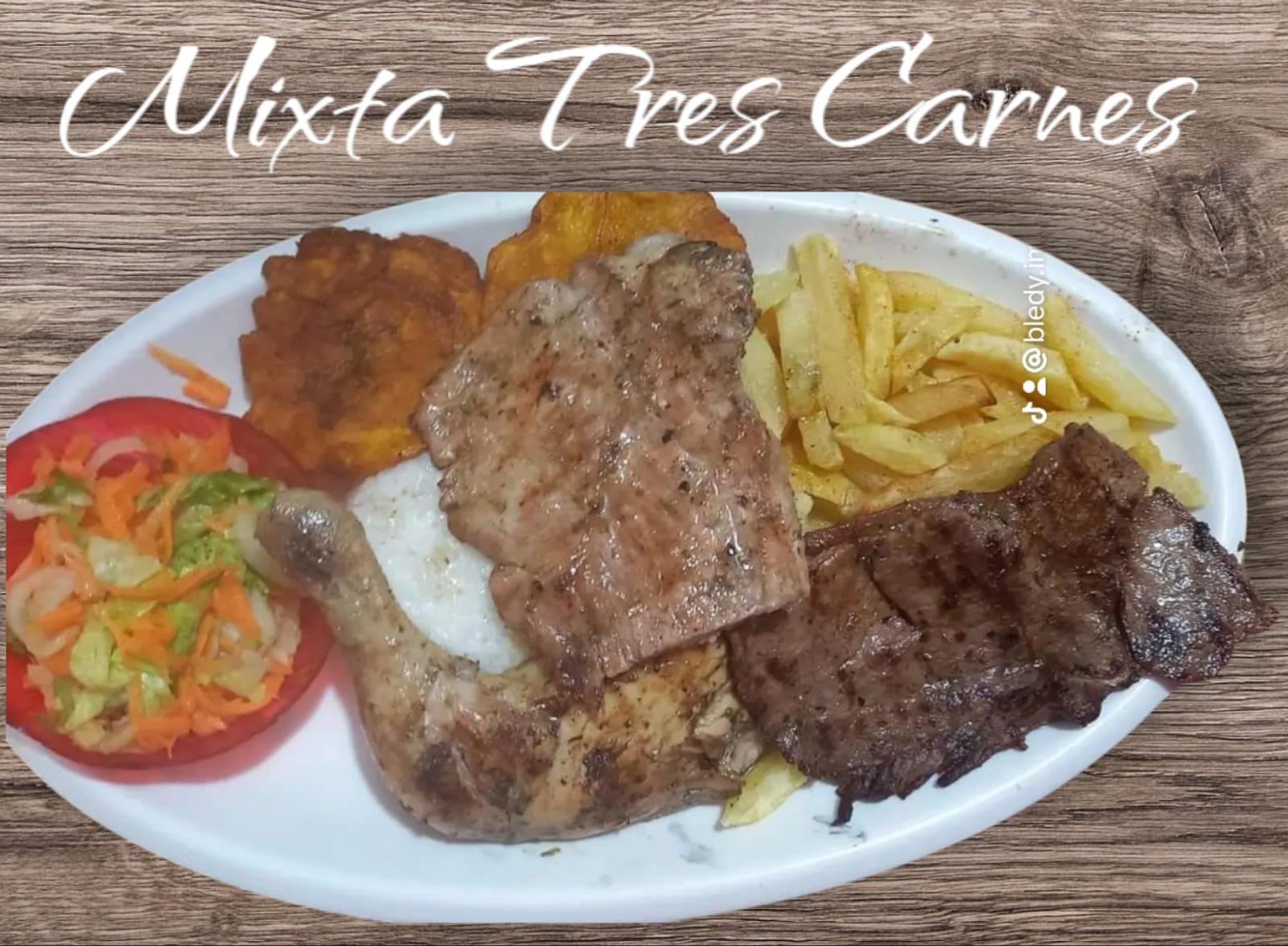 Sopa del día, francesa, arroz, ensalada de la casa, patacón o croquetas de yuca y limonada natural 12 oz,} escoge 3 proteínas, res, cerdo, pechuga, pierna pernil.