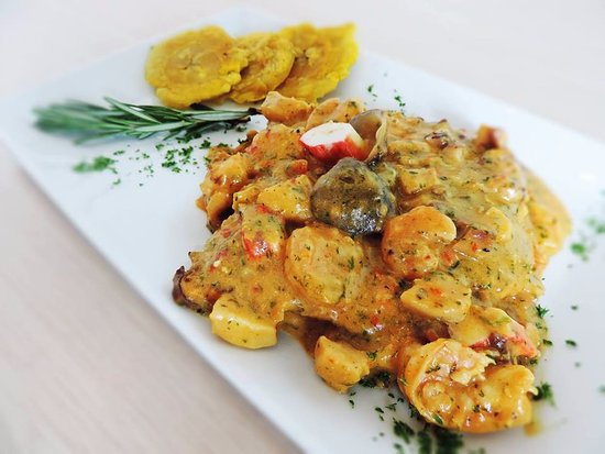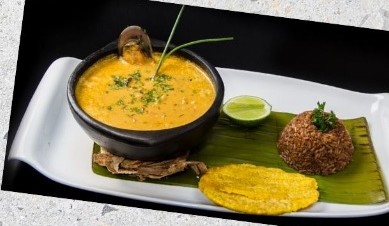 Crema, mariscos, camarones, palmito, queso, arroz y patacón.