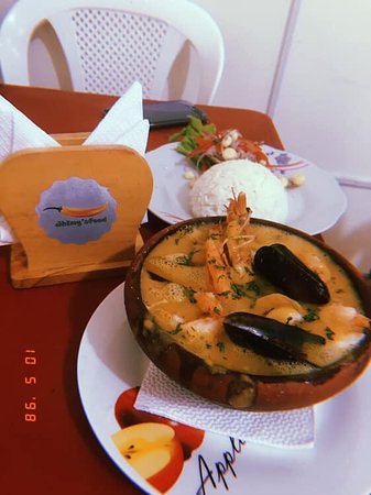 Mariscos, camarón, mejillón negro, muela de jaiba, langostino, palmito con queso, arroz coco o blanco y patacón.