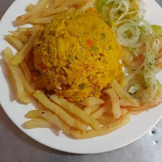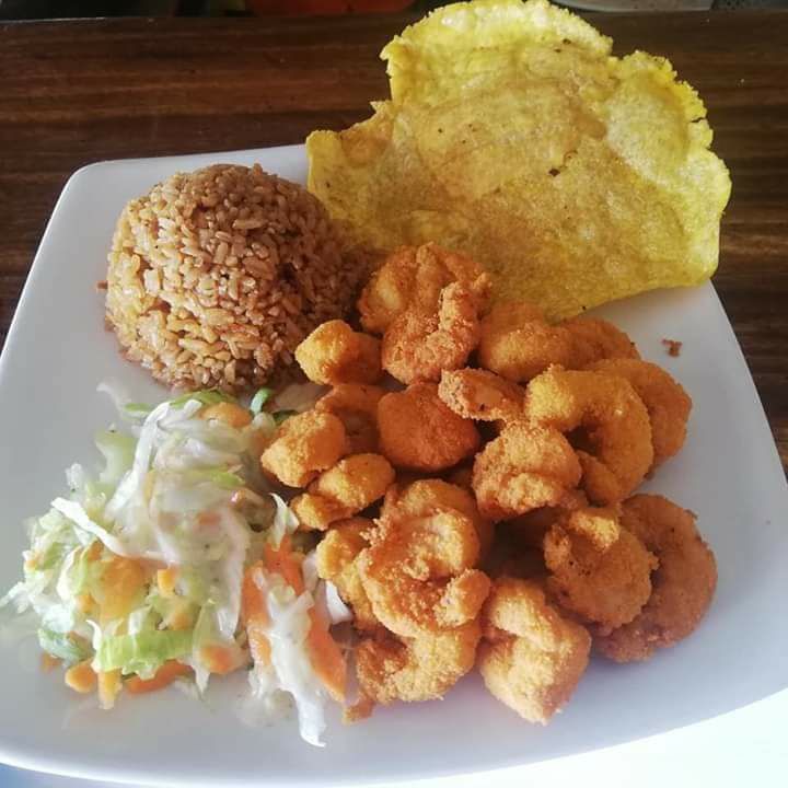 arroz, camarones, verduras, patacón, sancocho de pescado.