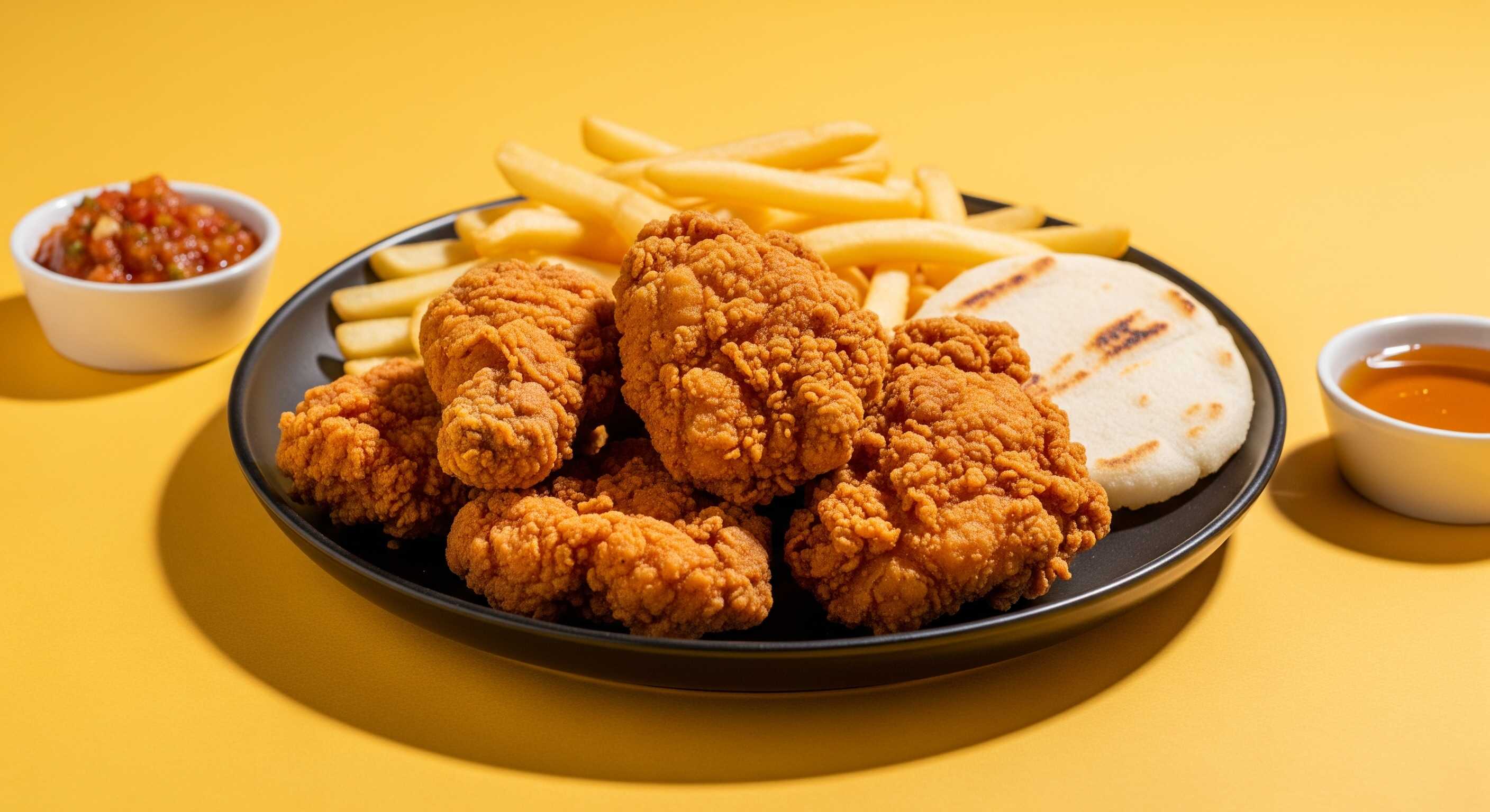 1 Pollo broaster, con papa a la francesa, arepa, salsas y ají.