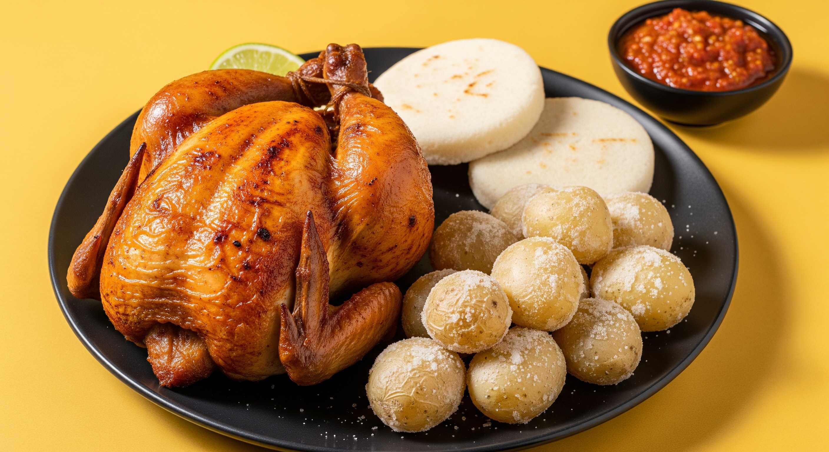 1 Pollo asado, con papa salada, arepa, salsas: tomate, mayonesa, miel y ají.