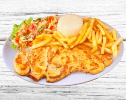 Pechuga asada, acompañada de papa a la francesa, yuca o patacón, arroz y ensalada de la casa: tomate, cebolla y lechuga.