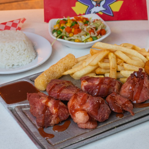 Lomo de cerdo a la plancha, acompañado de papa a la francesa, yuca o patacón, arroz y ensalada de la casa: tomate, cebolla y lechuga.