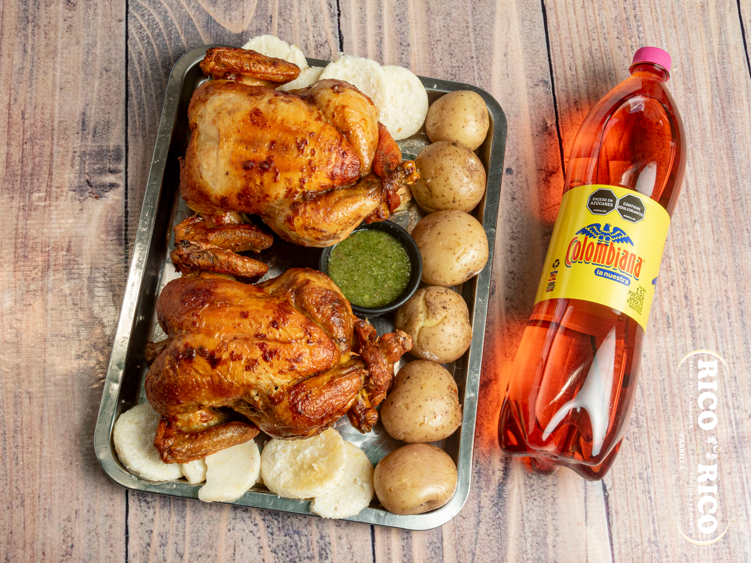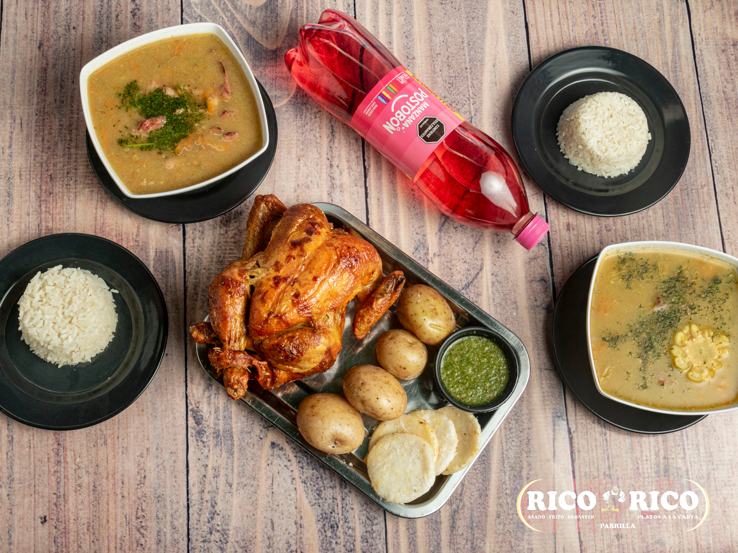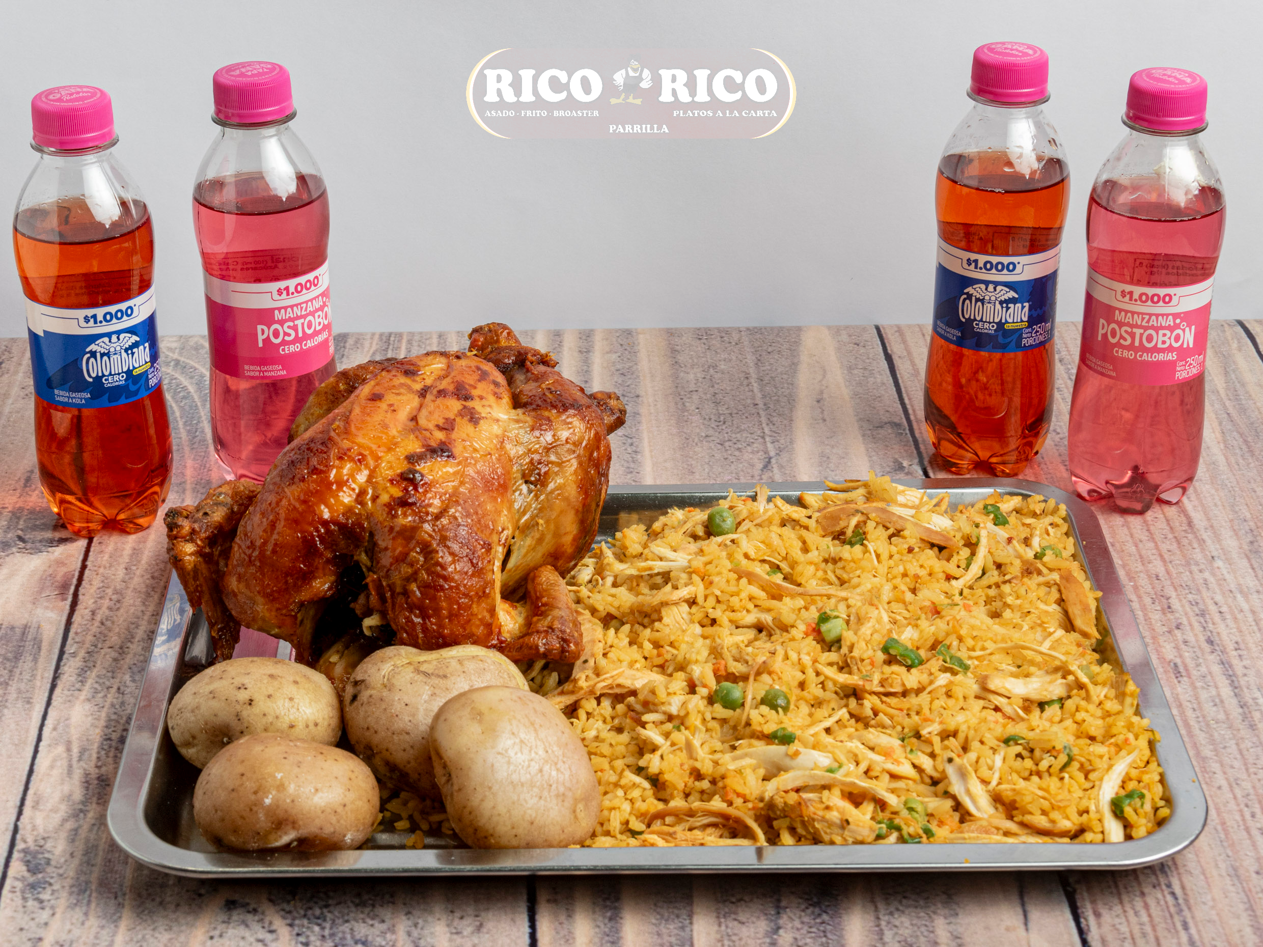 1 Pollo asado, papas saladas, arepa, 2 sopas del día, 2 porciones de arroz, 1 gaseosa Postobón 1 L (sabor sujeto a disponibilidad de la tienda).