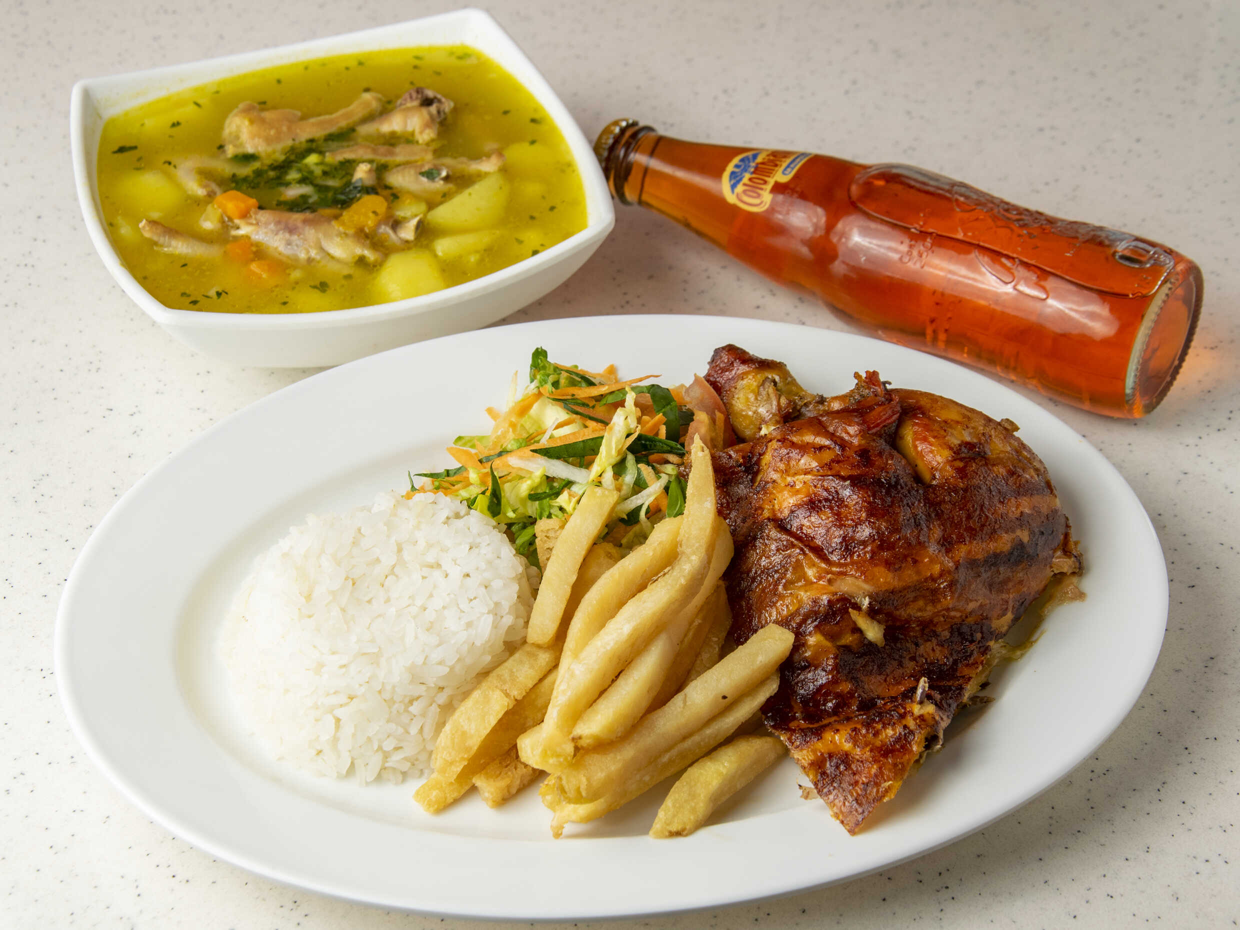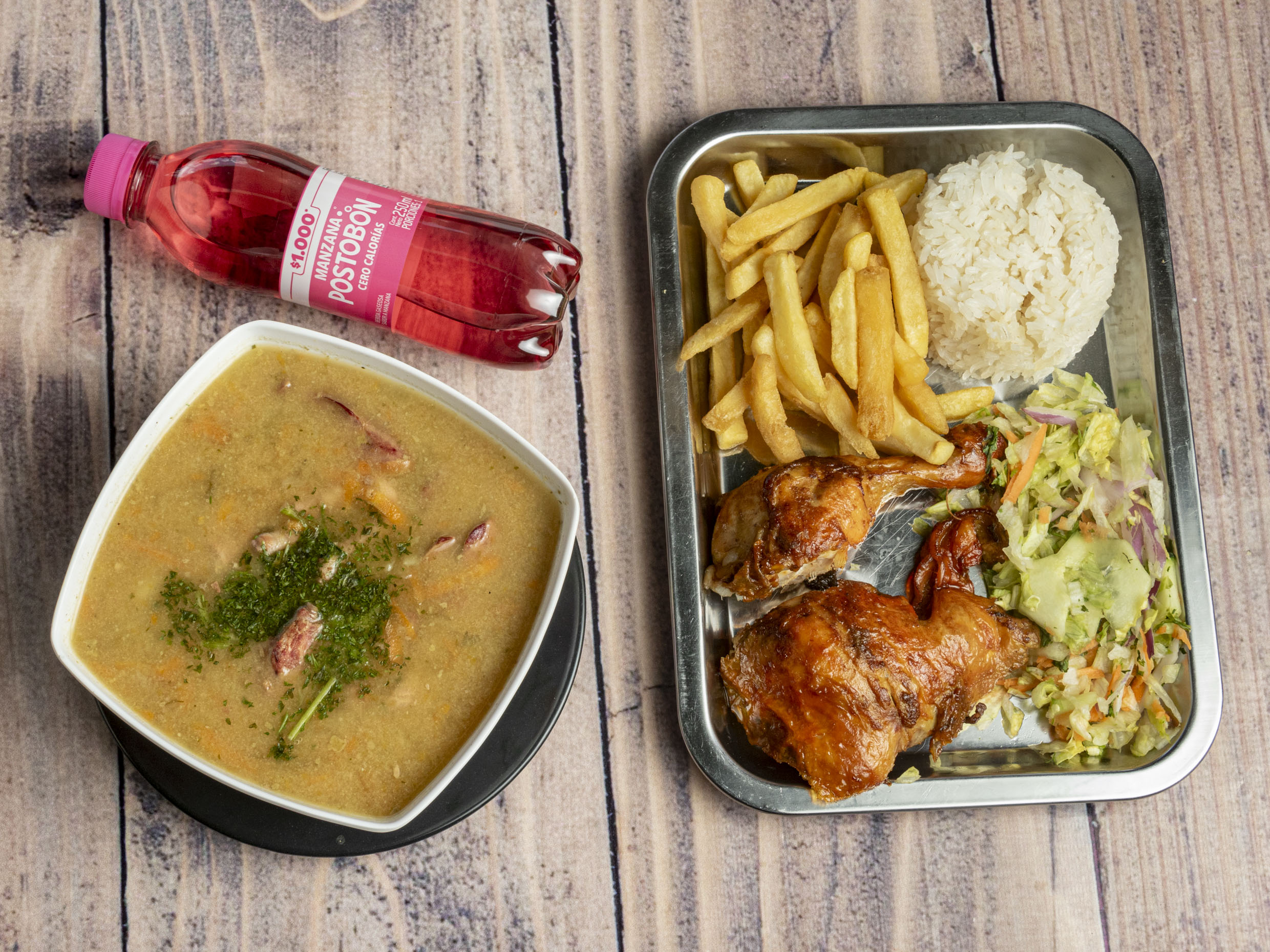 1/4 de pollo, papa artesanal, arroz, ensalada, gaseosa mini postobón (sabor sujeto a disponibilidad de la tienda) y sopa del día