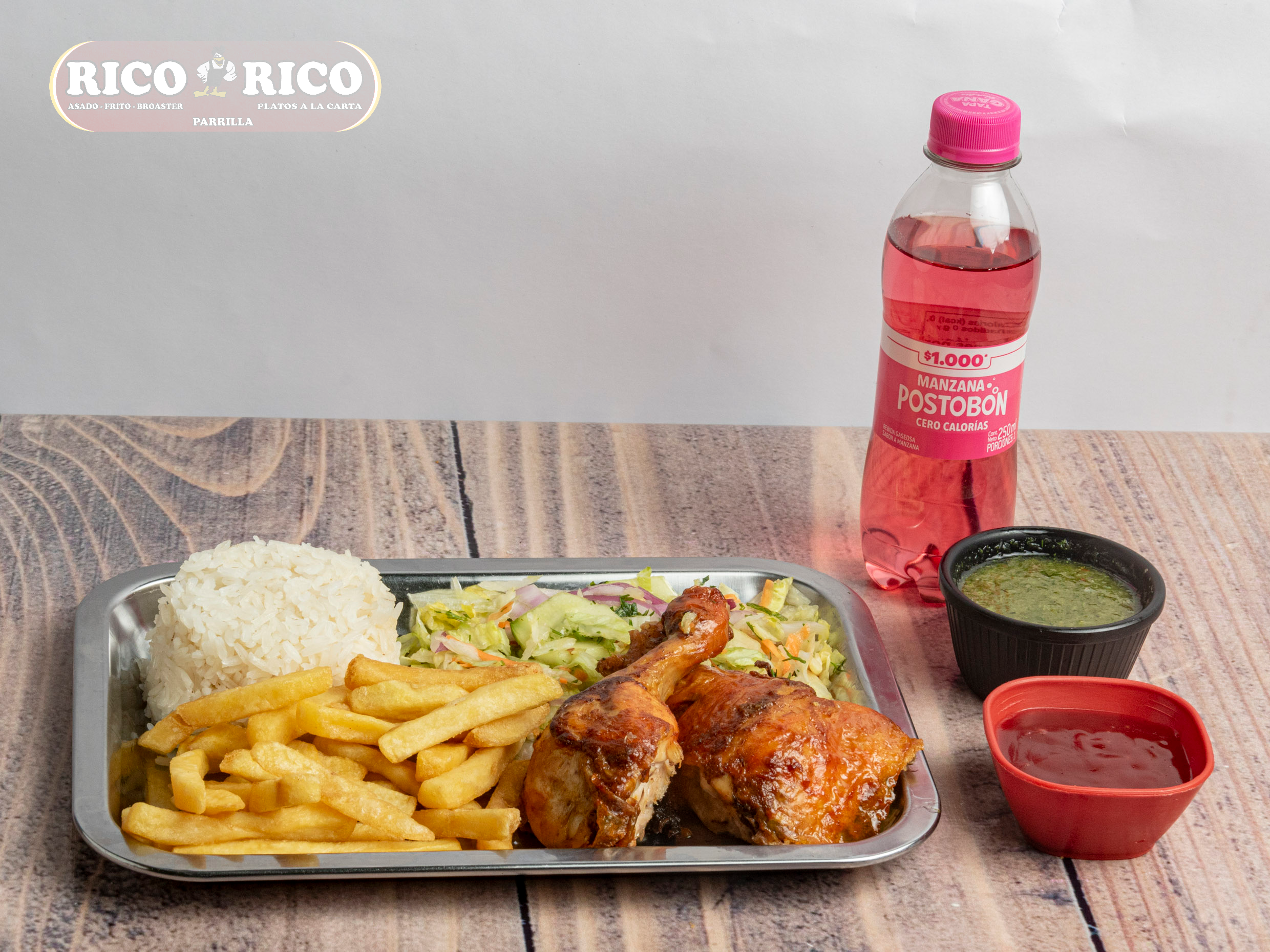 1/4 de pollo a elegir, papa artesanal, arroz, ensalada y gaseosa 250 ml postobón (sabor sujeto a disponibilidad de la tienda).