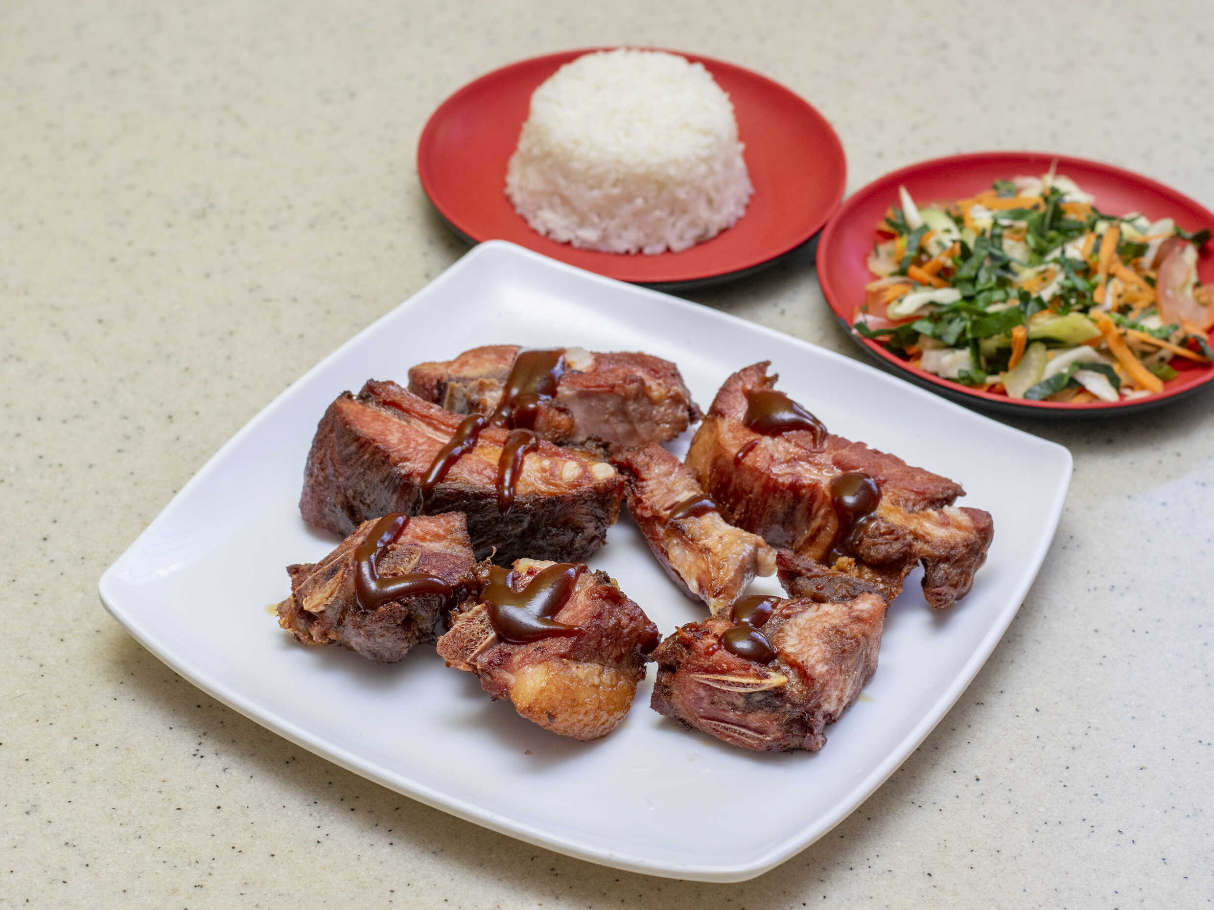 Costillitas, arroz, francesa, papas saladas y ensalada