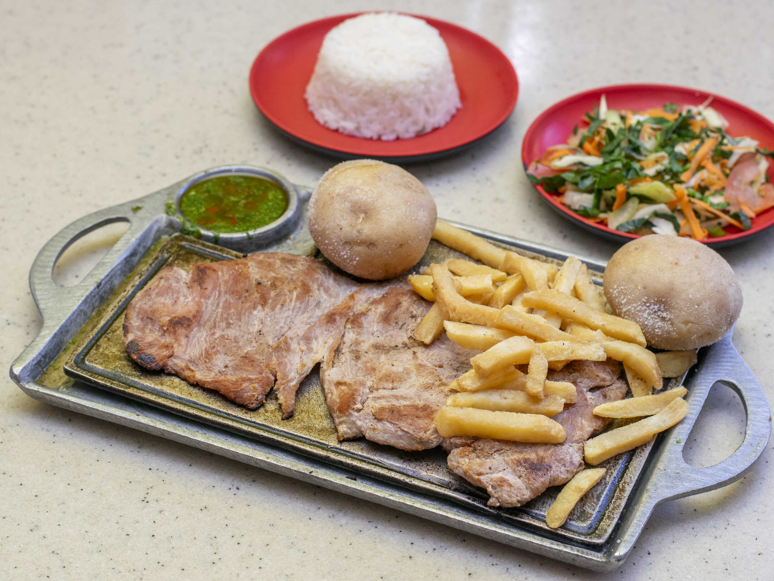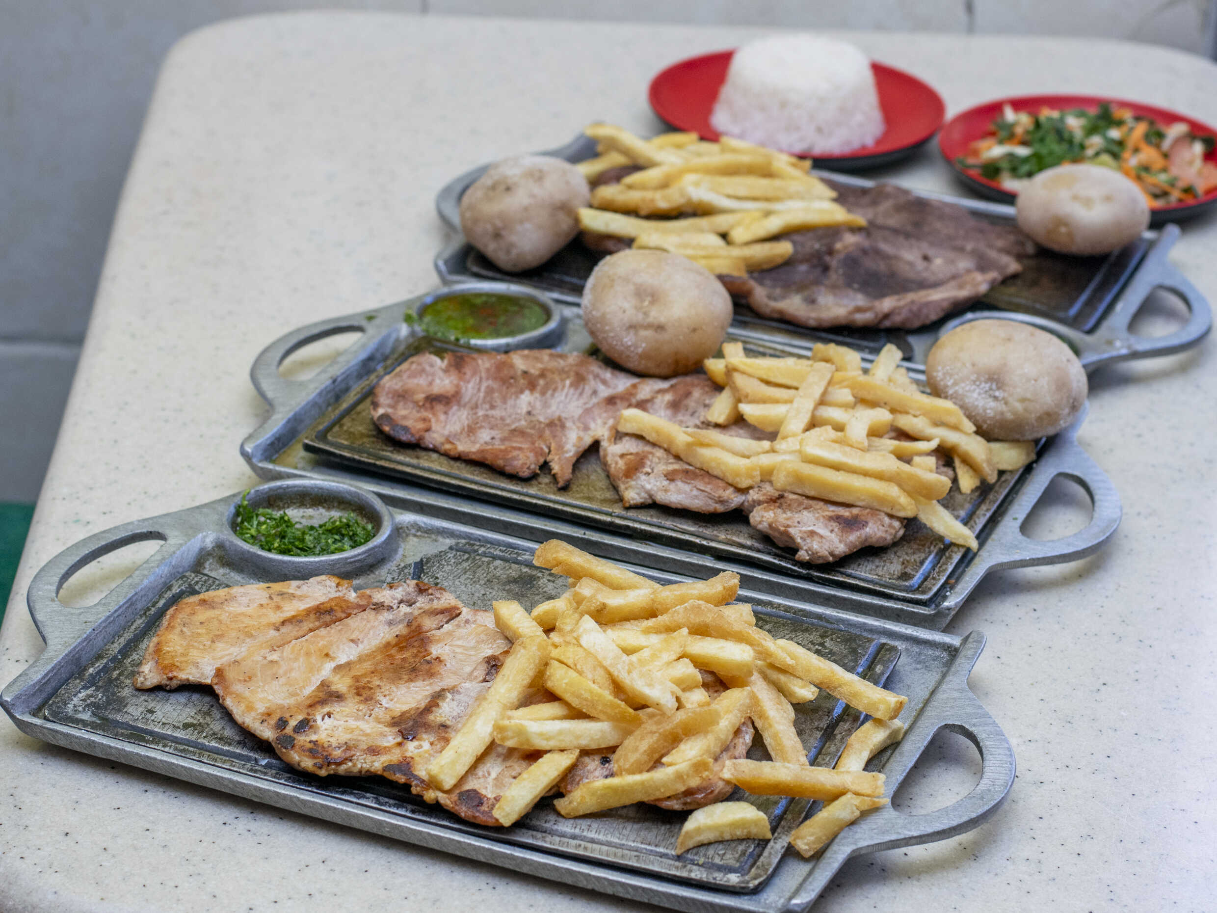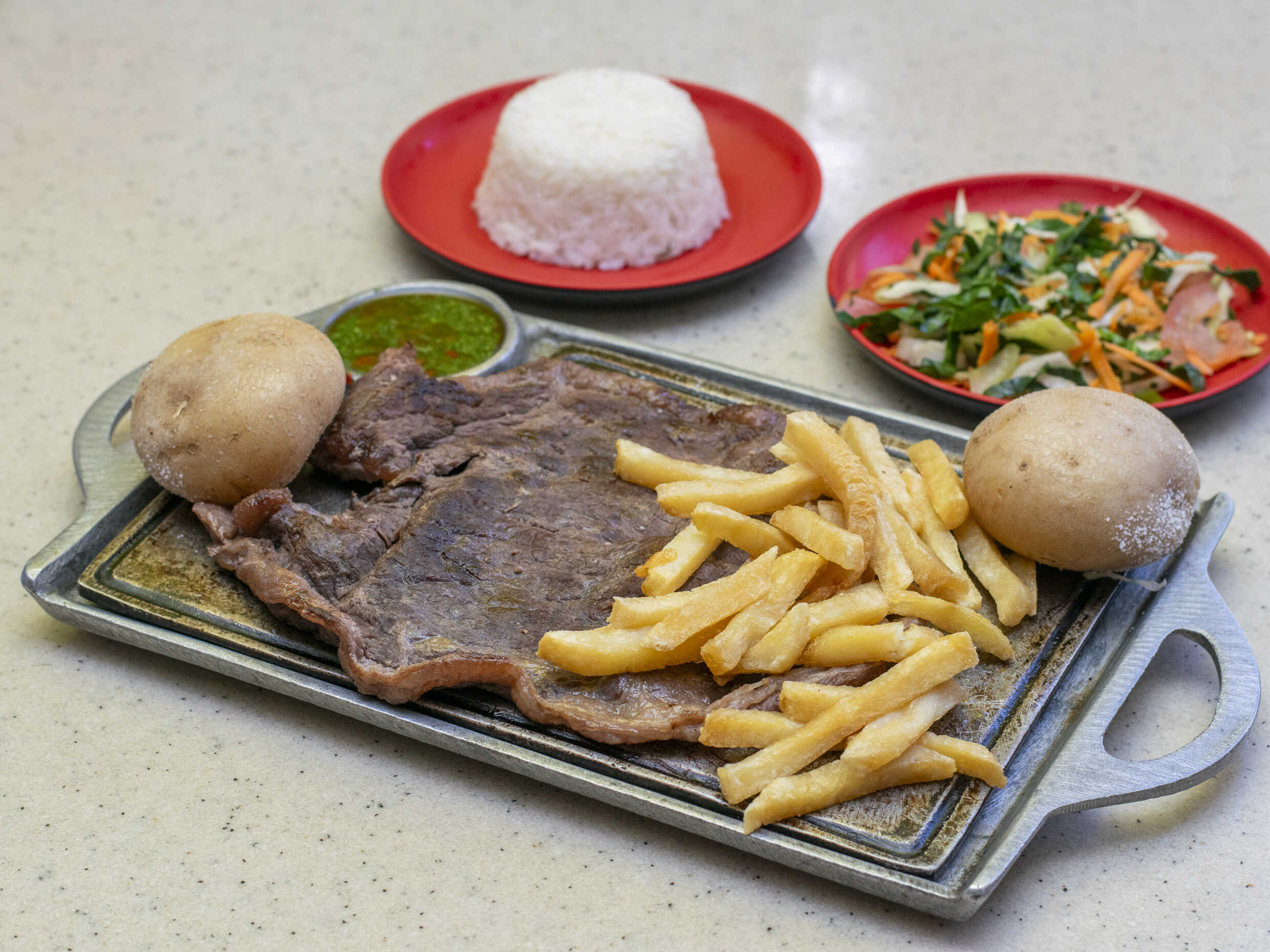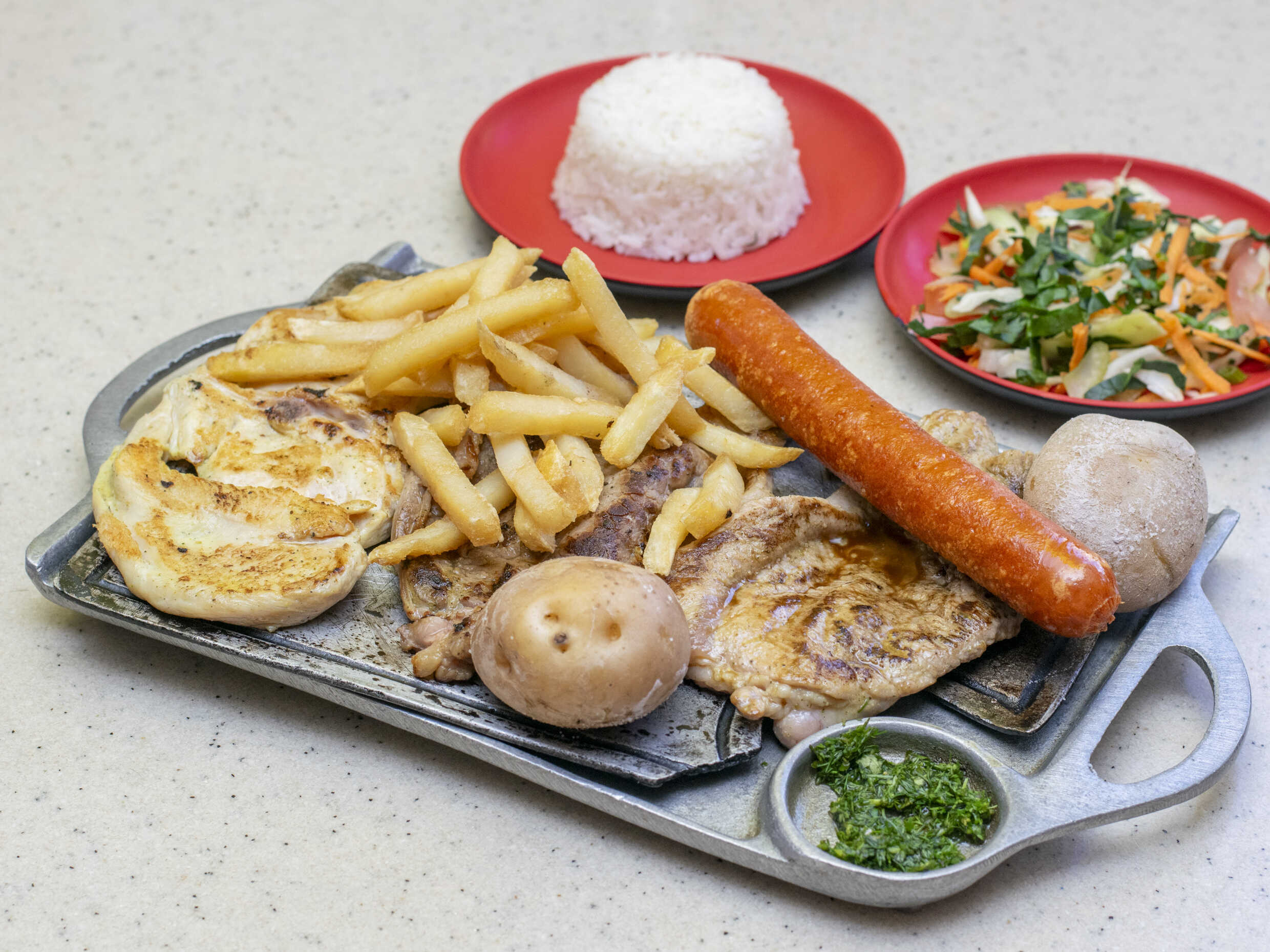 Churrasco, arroz, francesa, papas saladas y ensalada