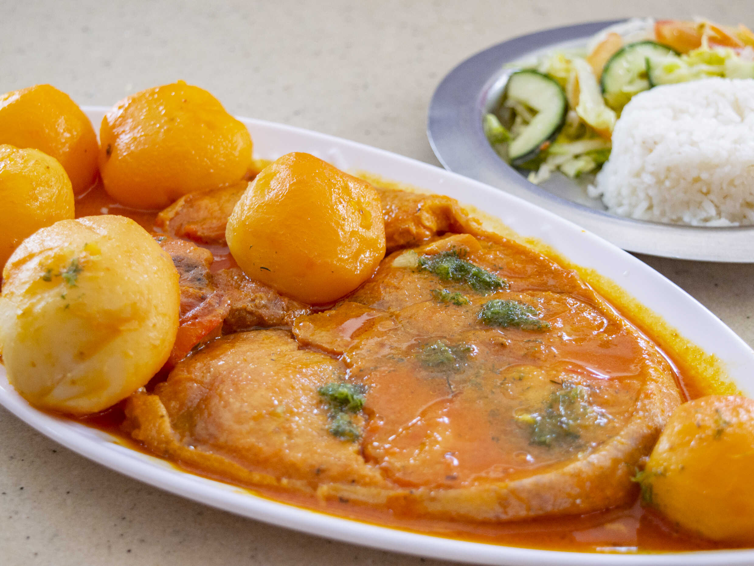 Arroz, francesa, papas saladas y ensalada
