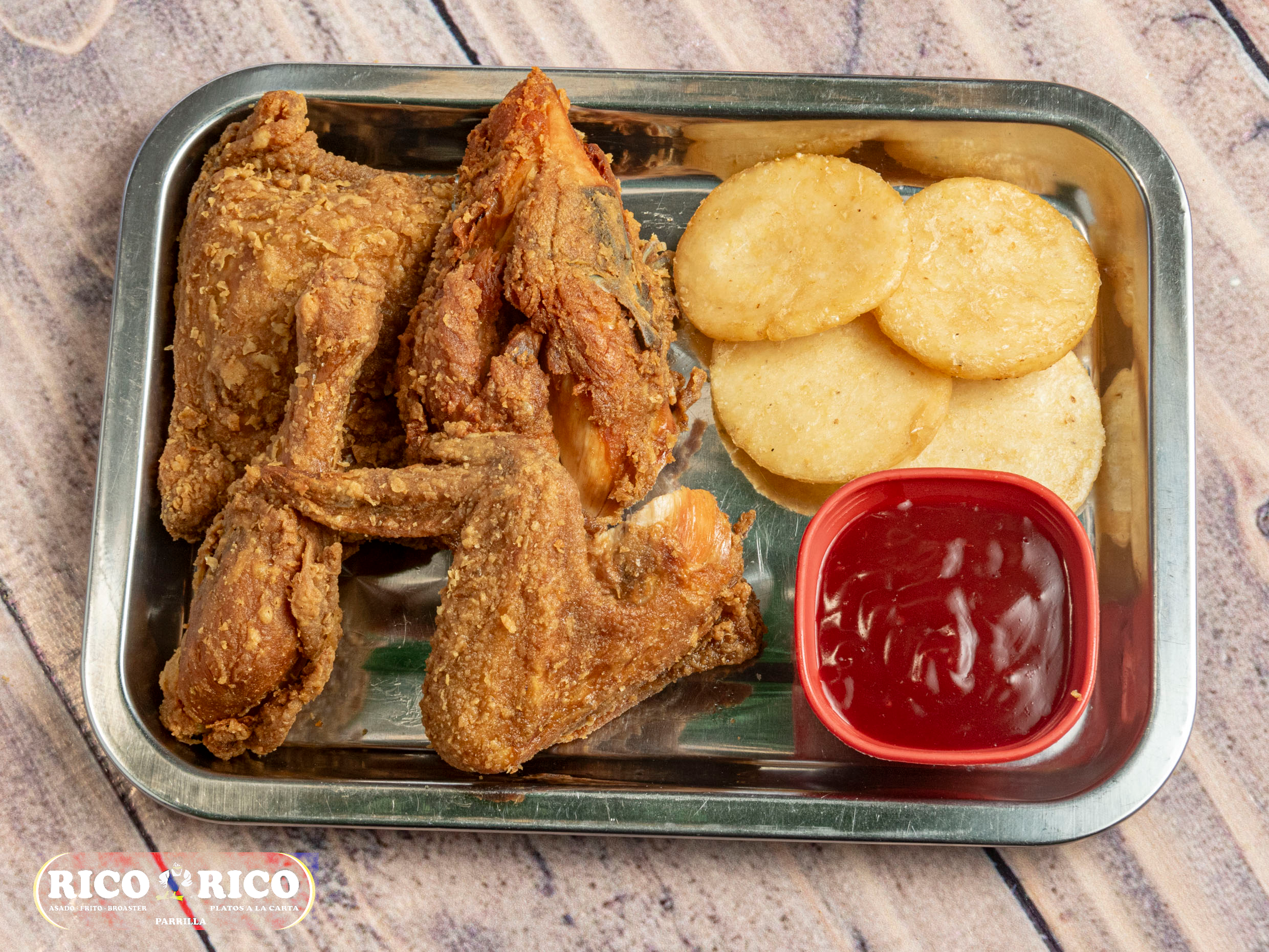8 presas de pollo (1400 gr), papa salada y arepa.