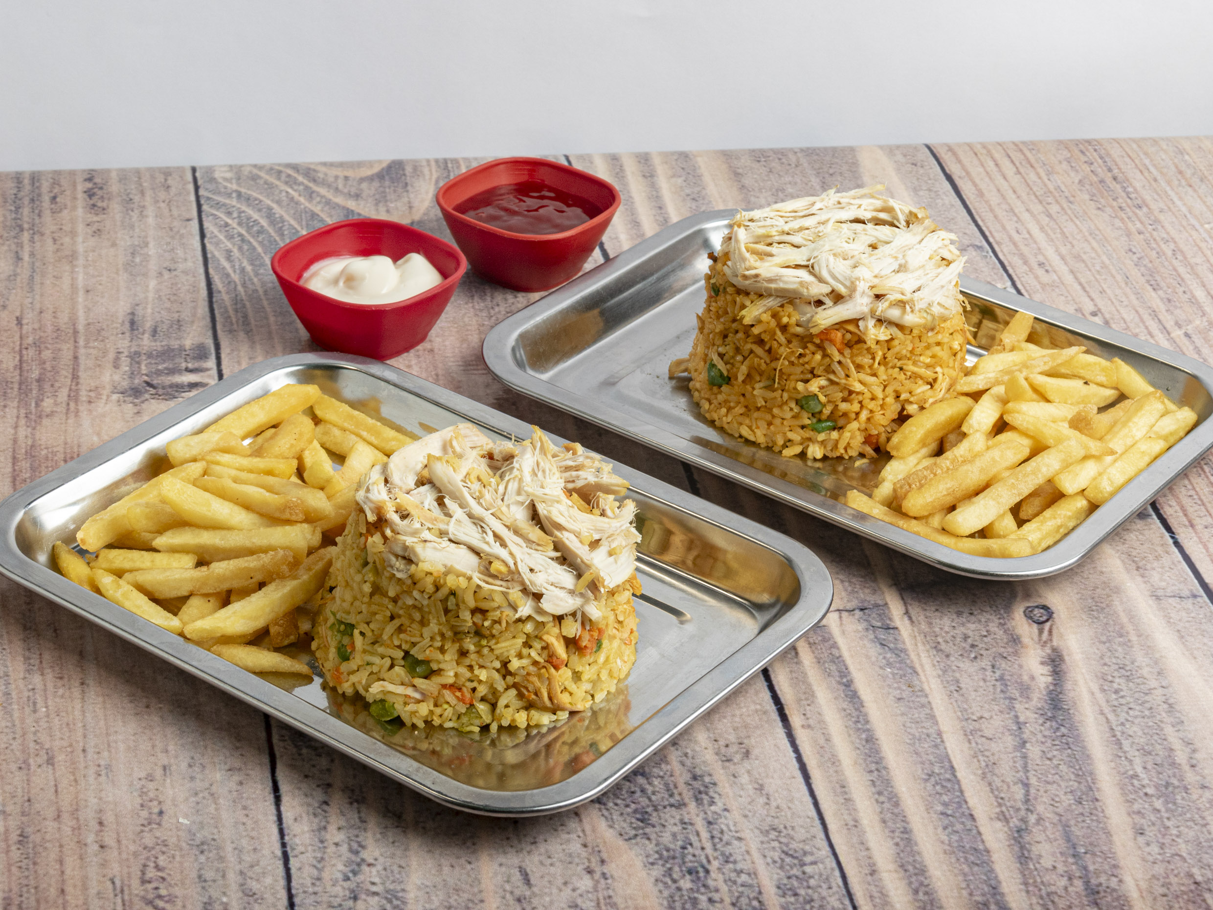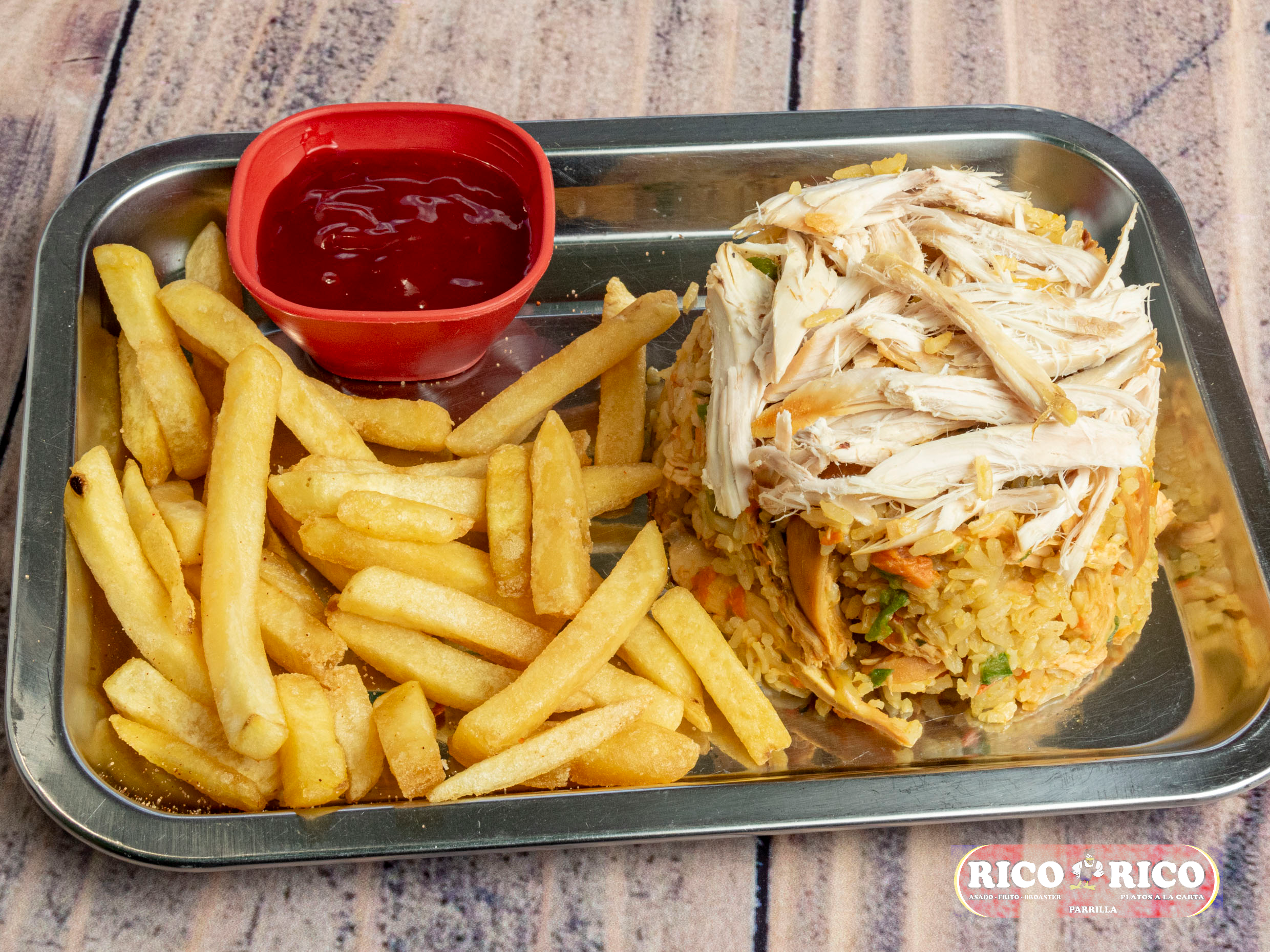 Arroz con pollo y papa francesa.