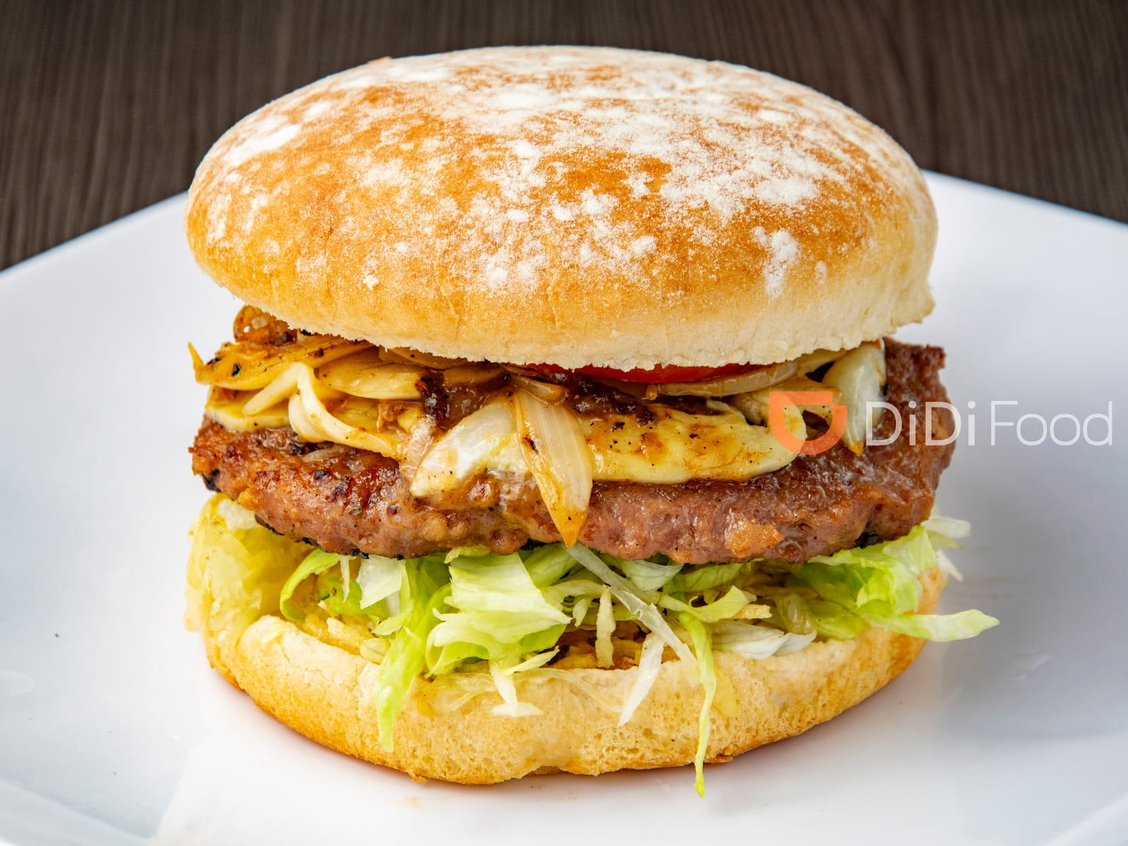pan artesanal, 125gr de carne de res, cebolla caramelizada, vegetales, salsas, queso.