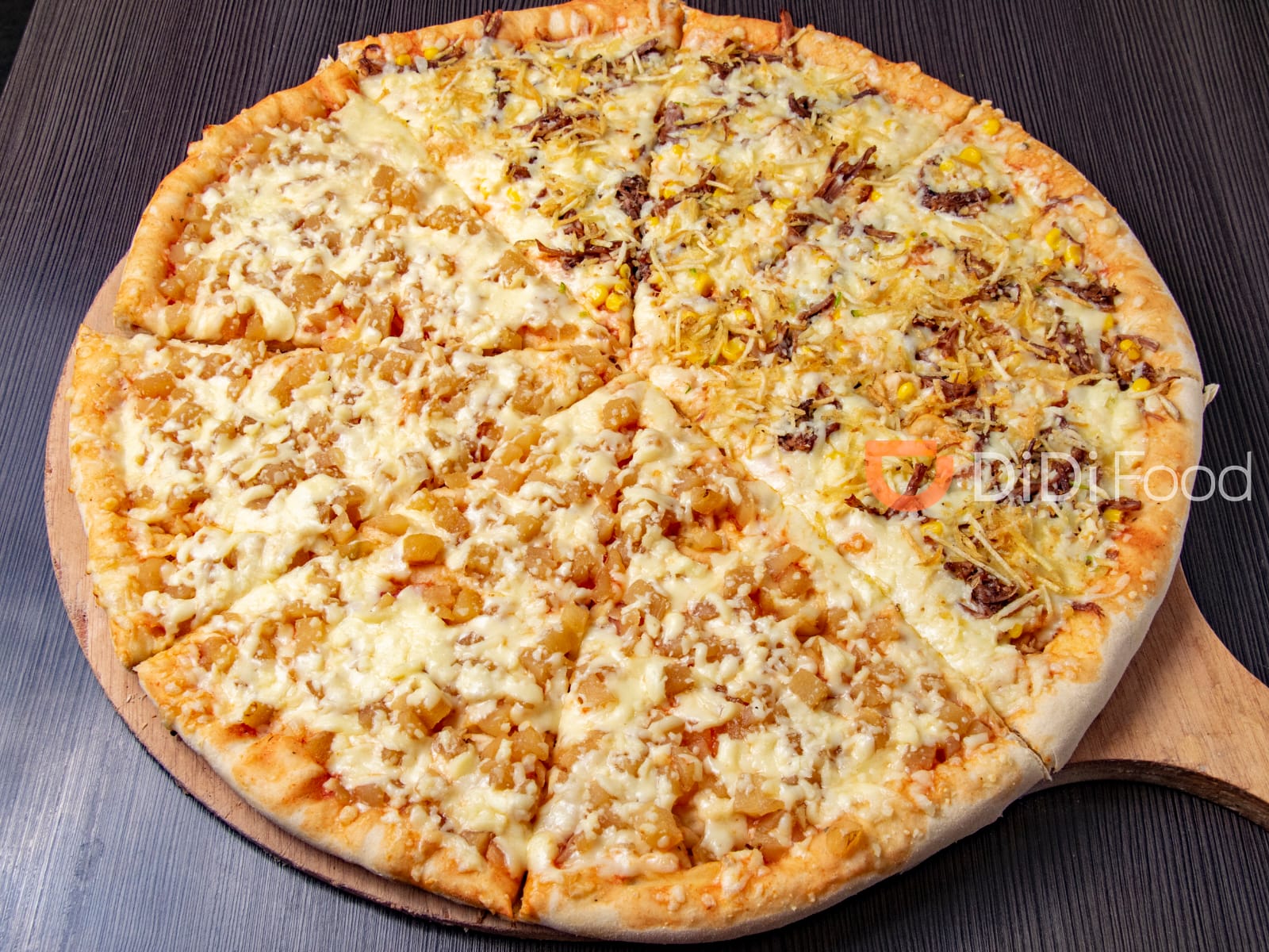 Pollo apanado, pollo desmechado, champiñon, tocineta, vegetales, salsas y queso.