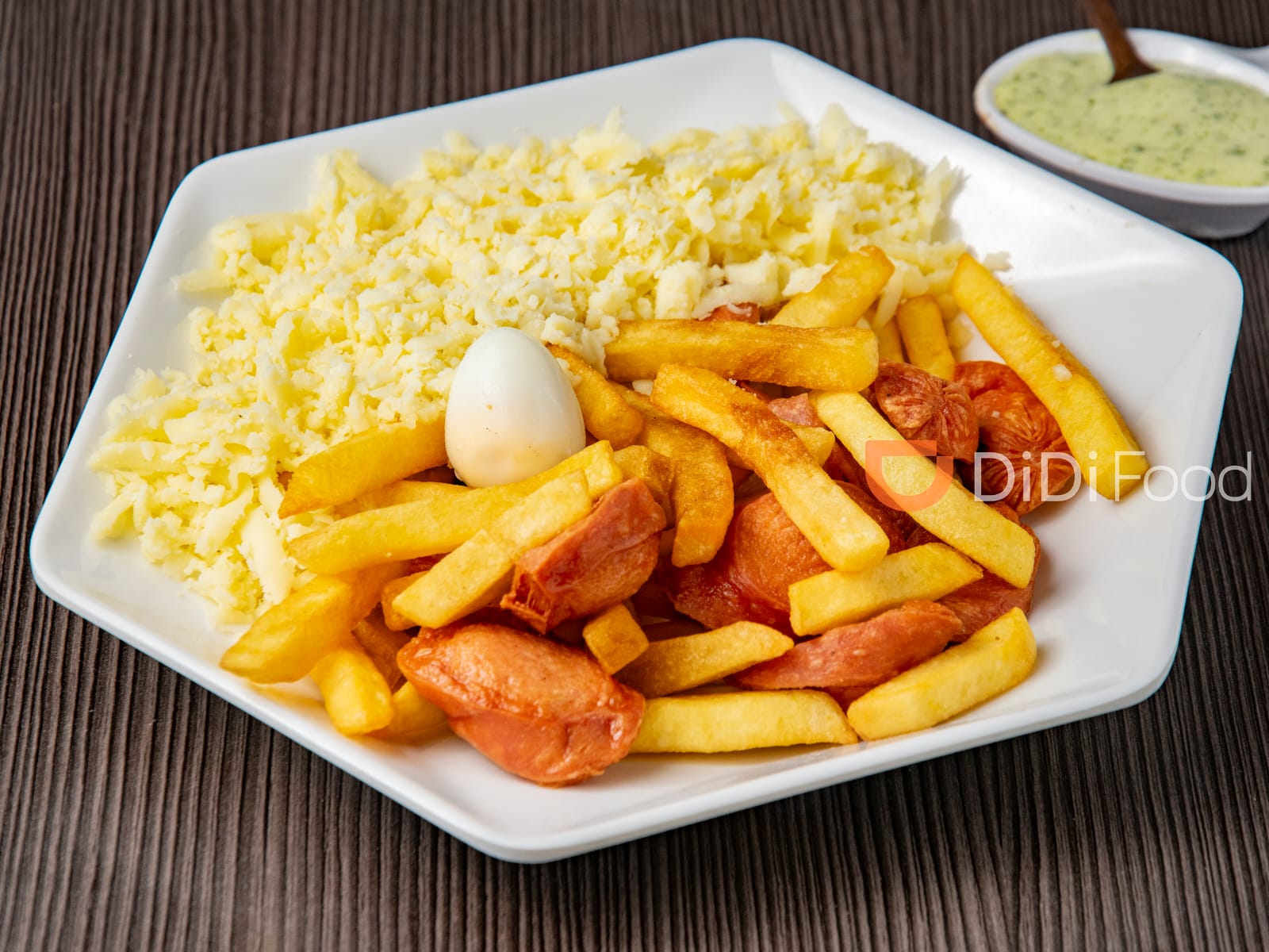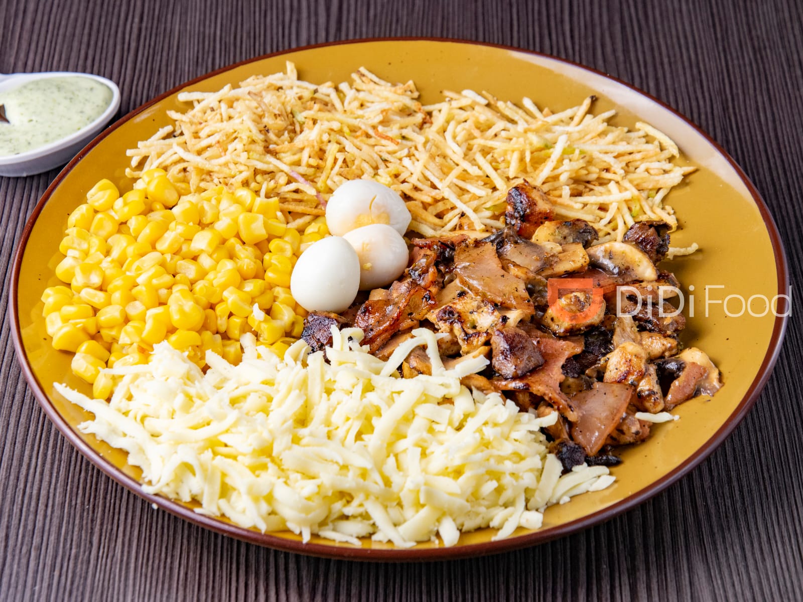 Chorizo, papa a la francesa, pollo desmechado, champiñon, huevo de codorniz y queso.
