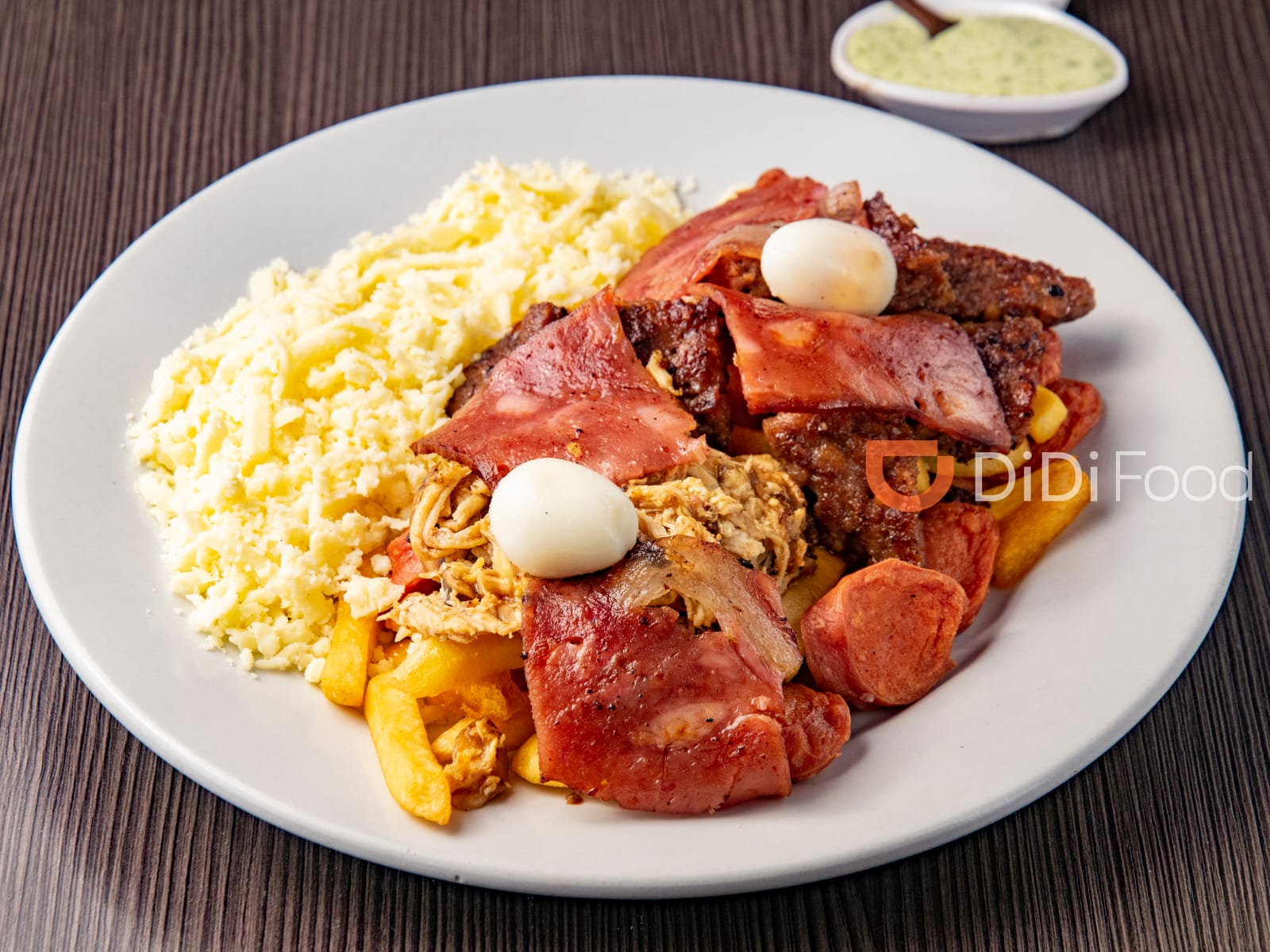 150 gramos de papa francesa, salchicha americana, tocineta, carne de hamburguesa picada, pollo con champiñones, huevos de codorniz, queso