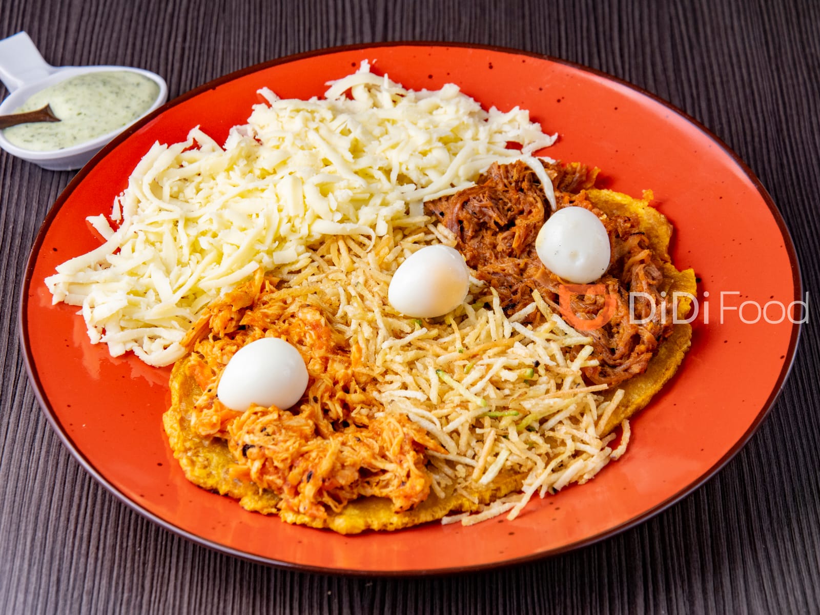 Arepa de maiz con carne desmechada, pollo, hogao, huevo de codorniz y queso.