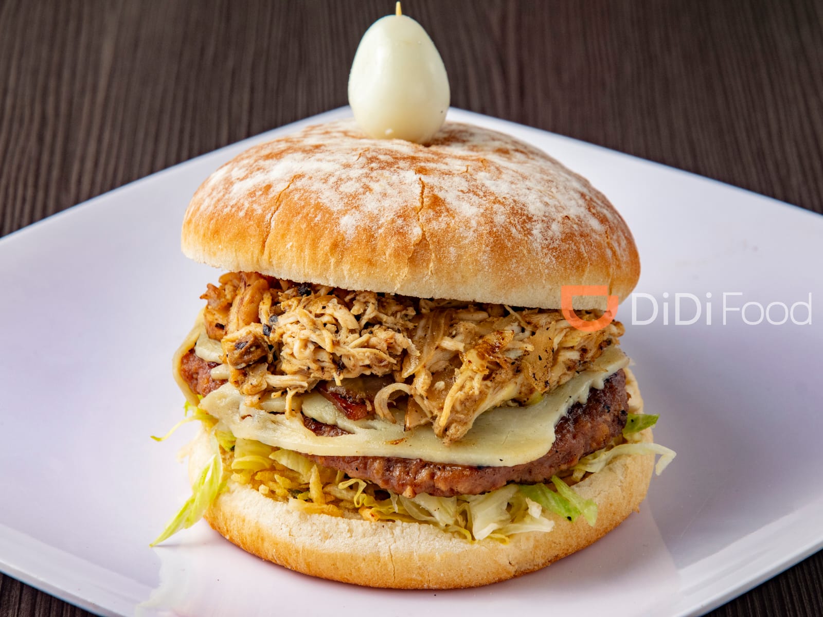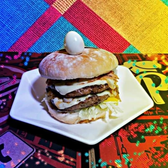 Hamburguesa de res, cerdo, tocineta, vegetales, huevo de codorniz, salsas y queso.