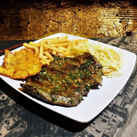300 gr de churrasco, papa francesa, patacon, ensalada
