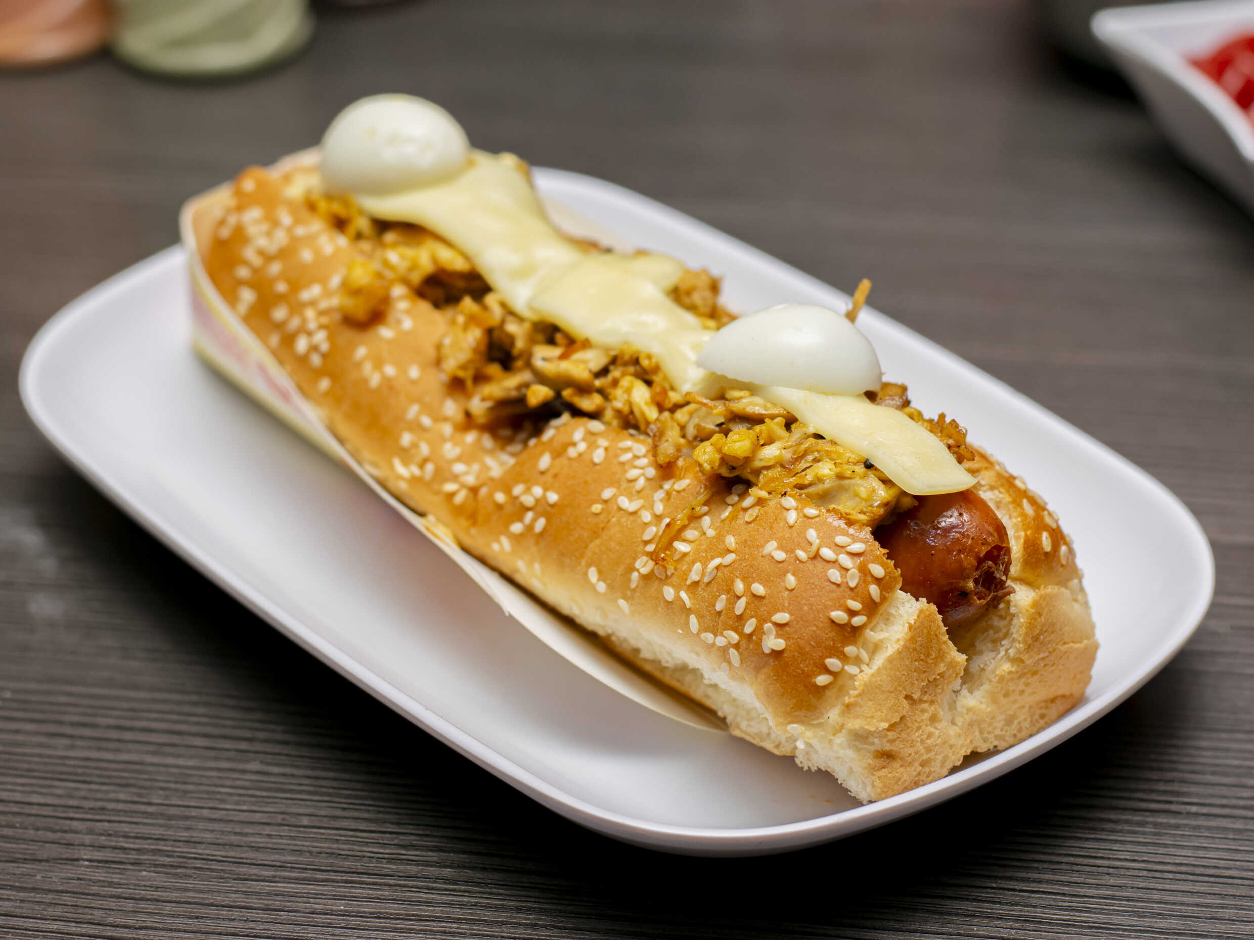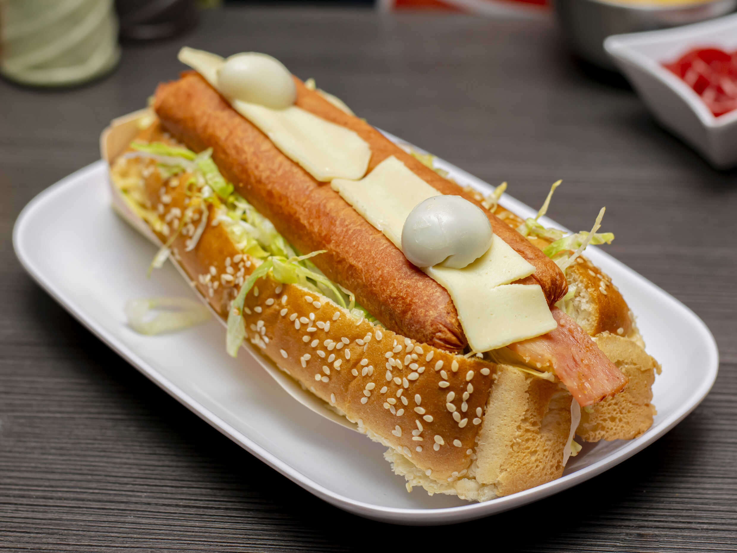 Salchicha, huevo de codorniz, cebolla, salsas, queso, papa chips.