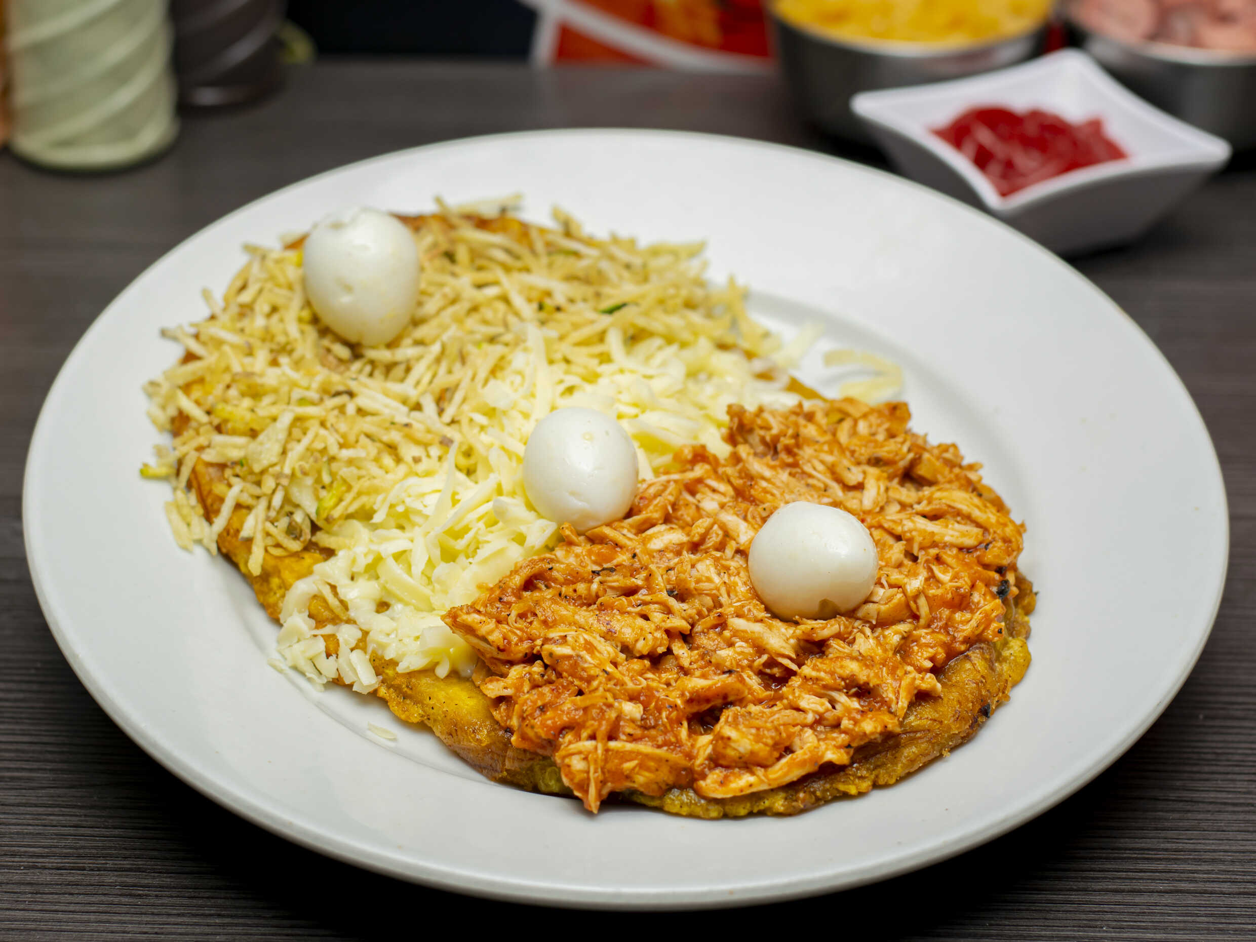 Patacon, pollo desmechado, hohao, queso y papa chips.
