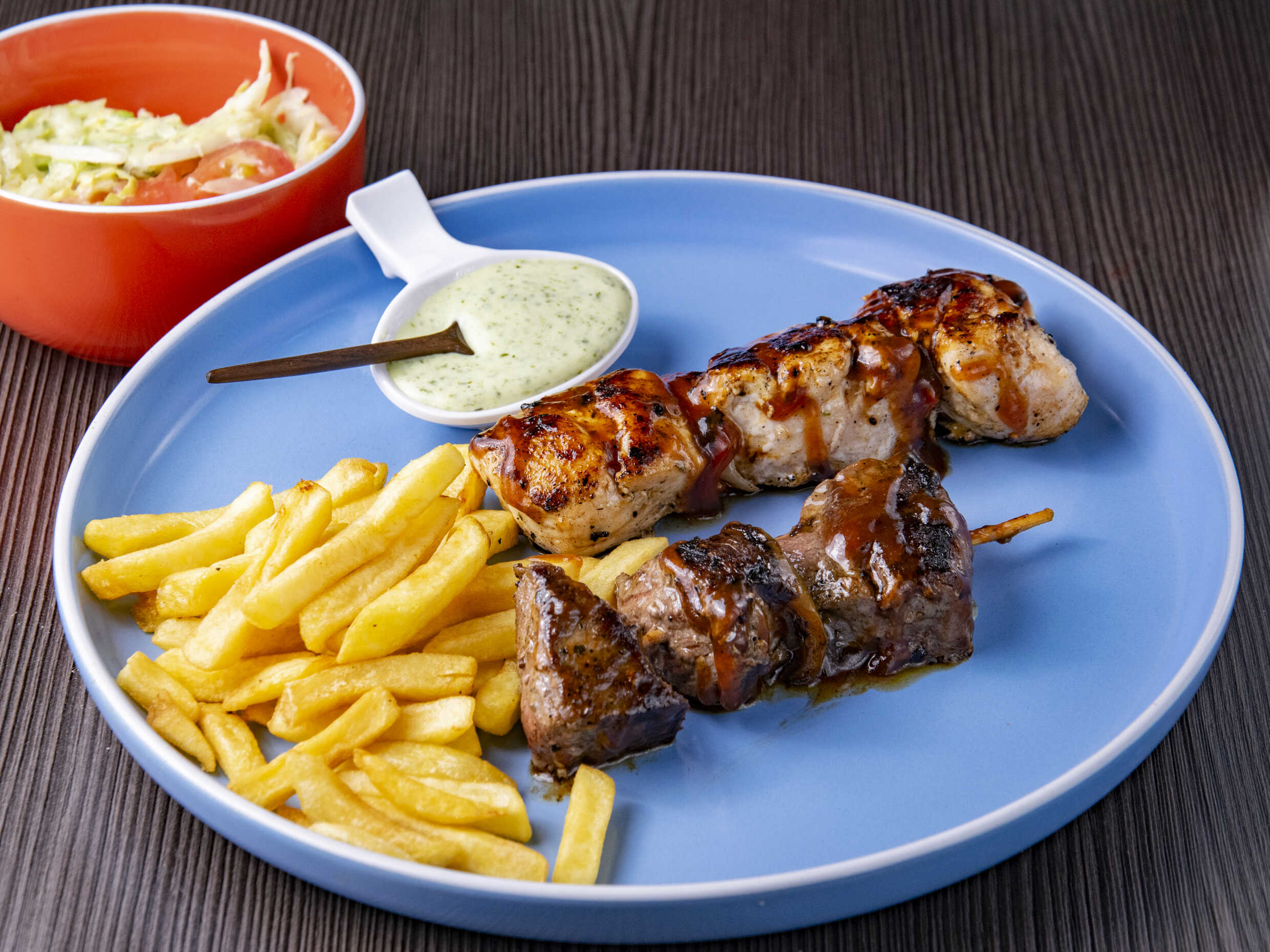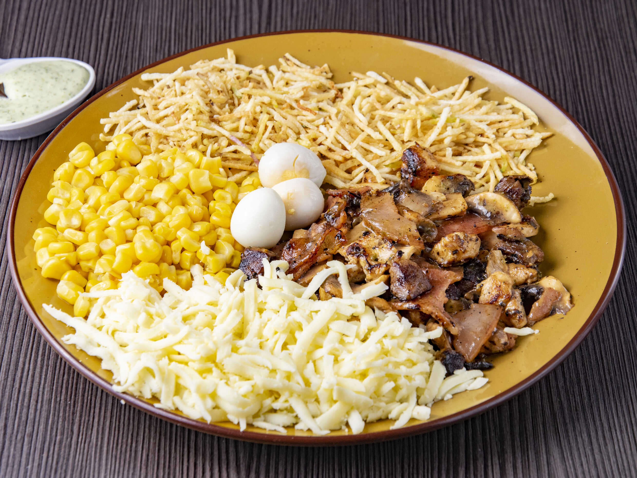 Carene de res, pollo apanado, tocineta, vegetales, huevo de codorniz, salsas y queso.