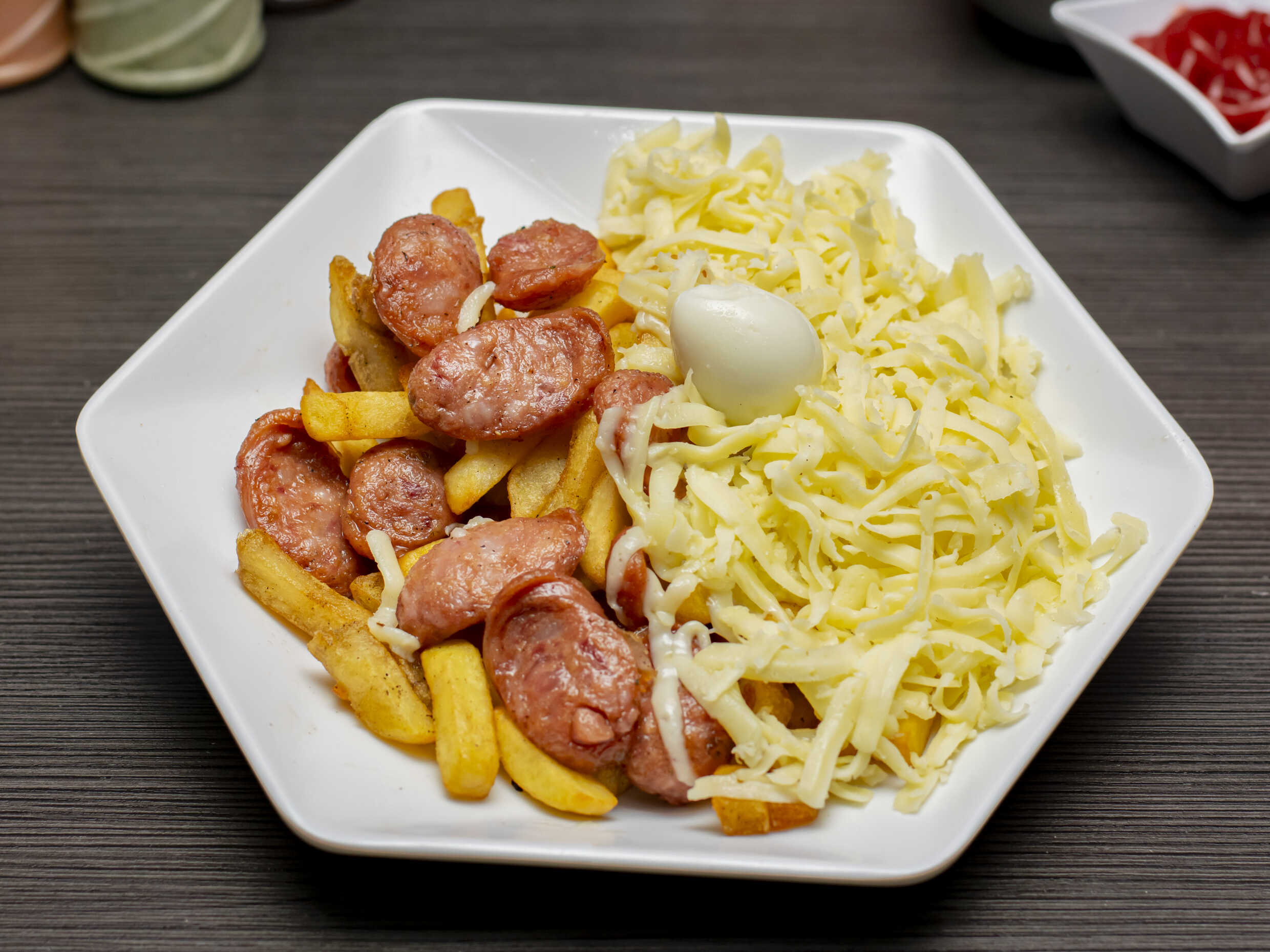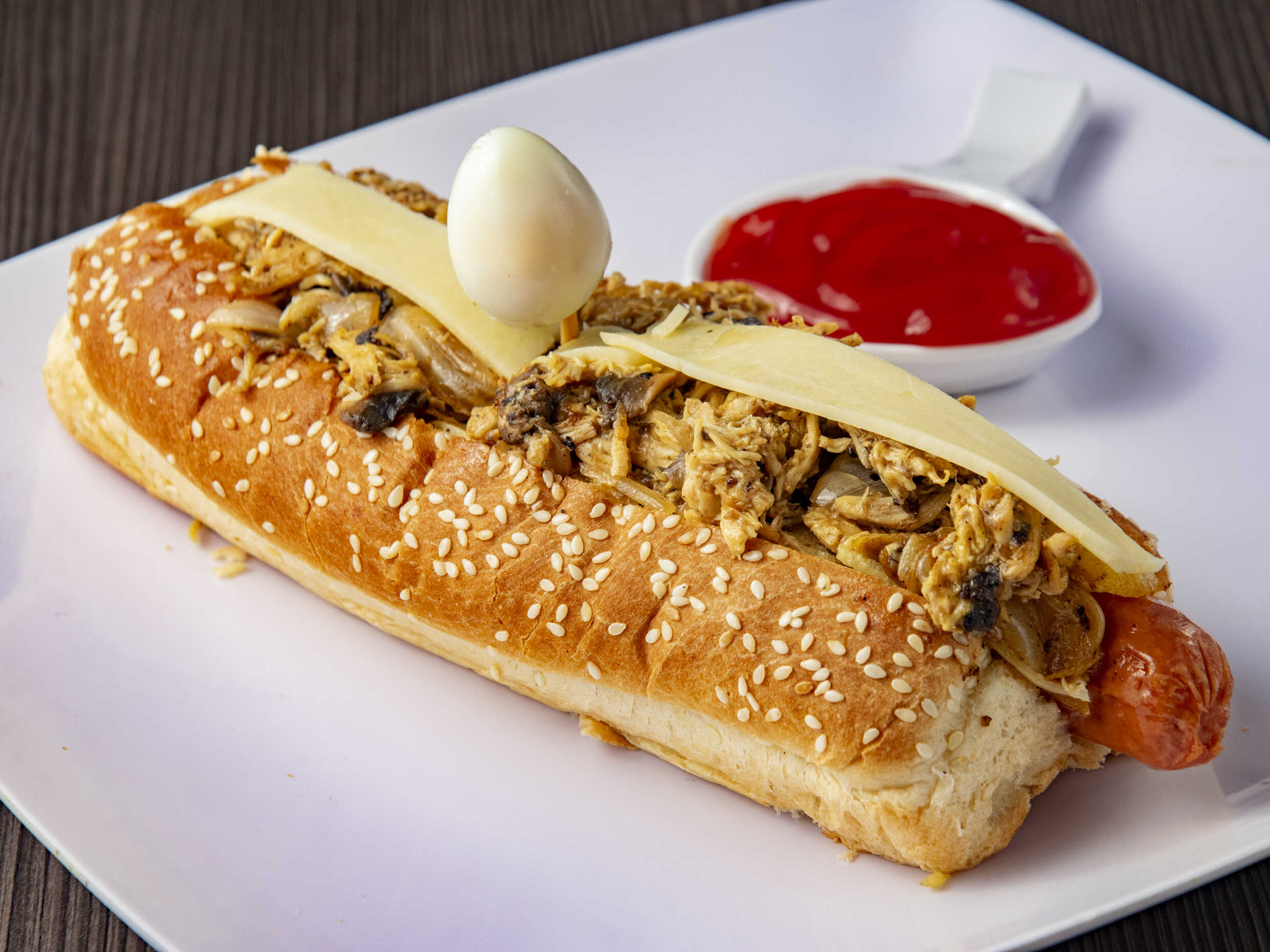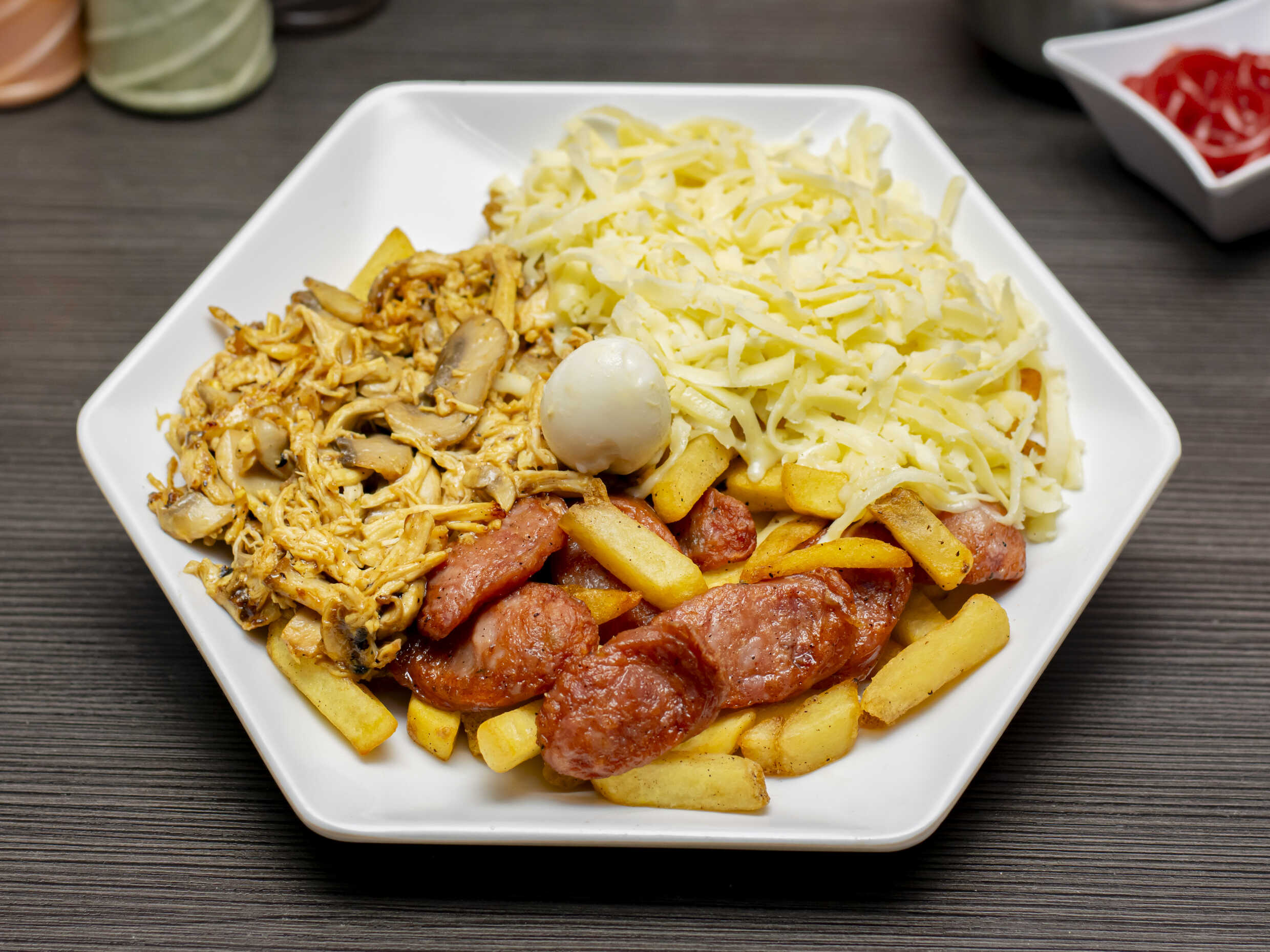 Salchicha america, papa a la francesa, huevo de codorniz, pollo desmechado, champiñon y queso.