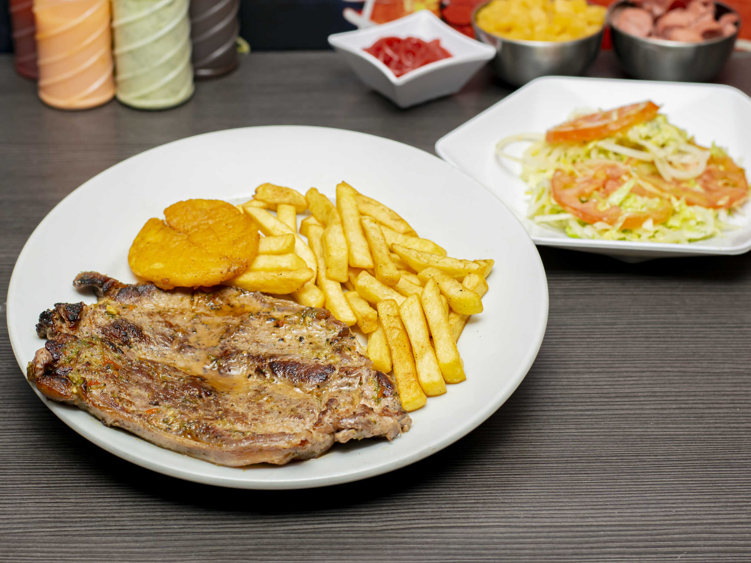Churrasco, papa a la prancesa, patacon y ensalada.
