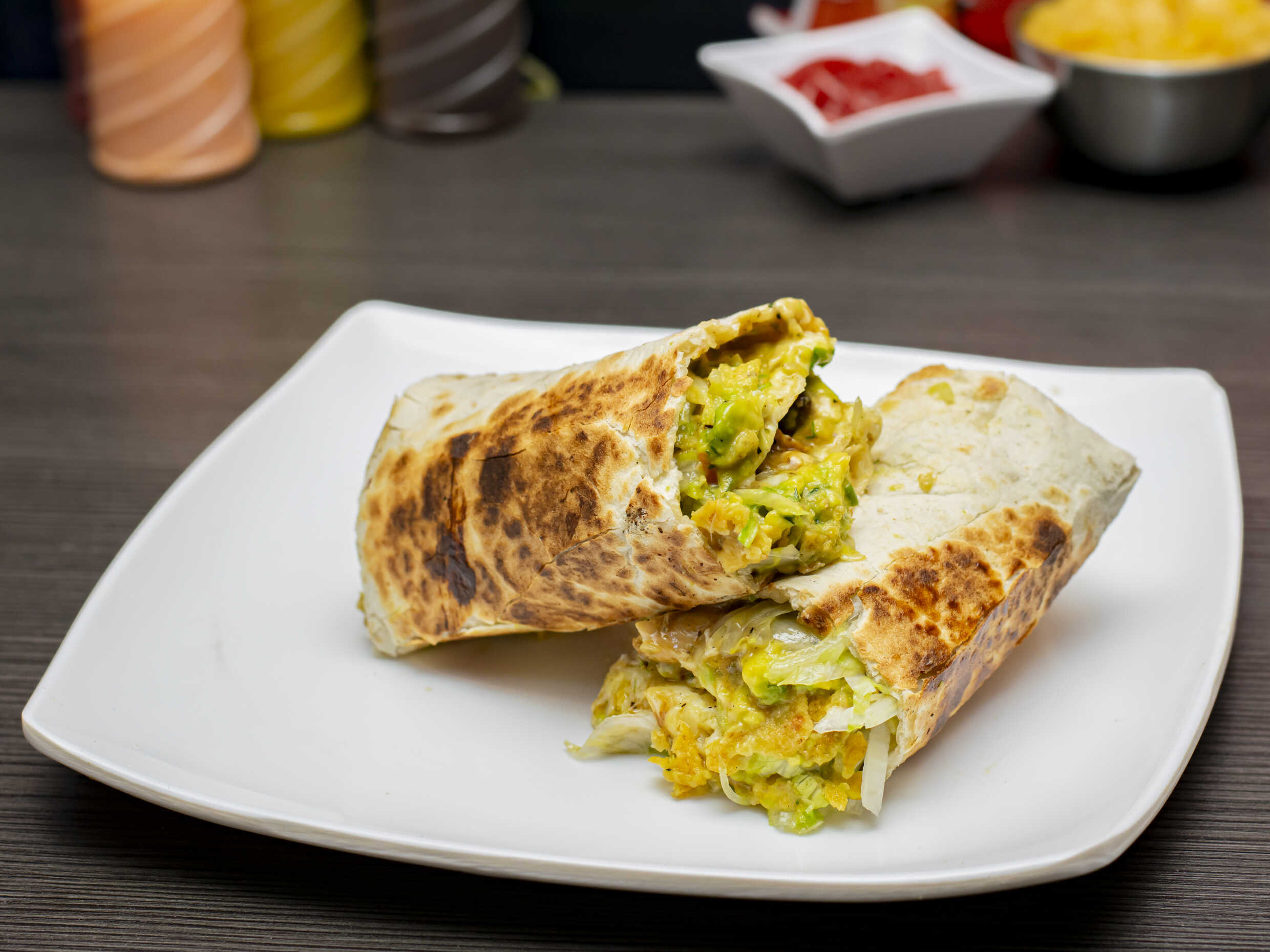 Carne de res, vegetales, salsas y queso.