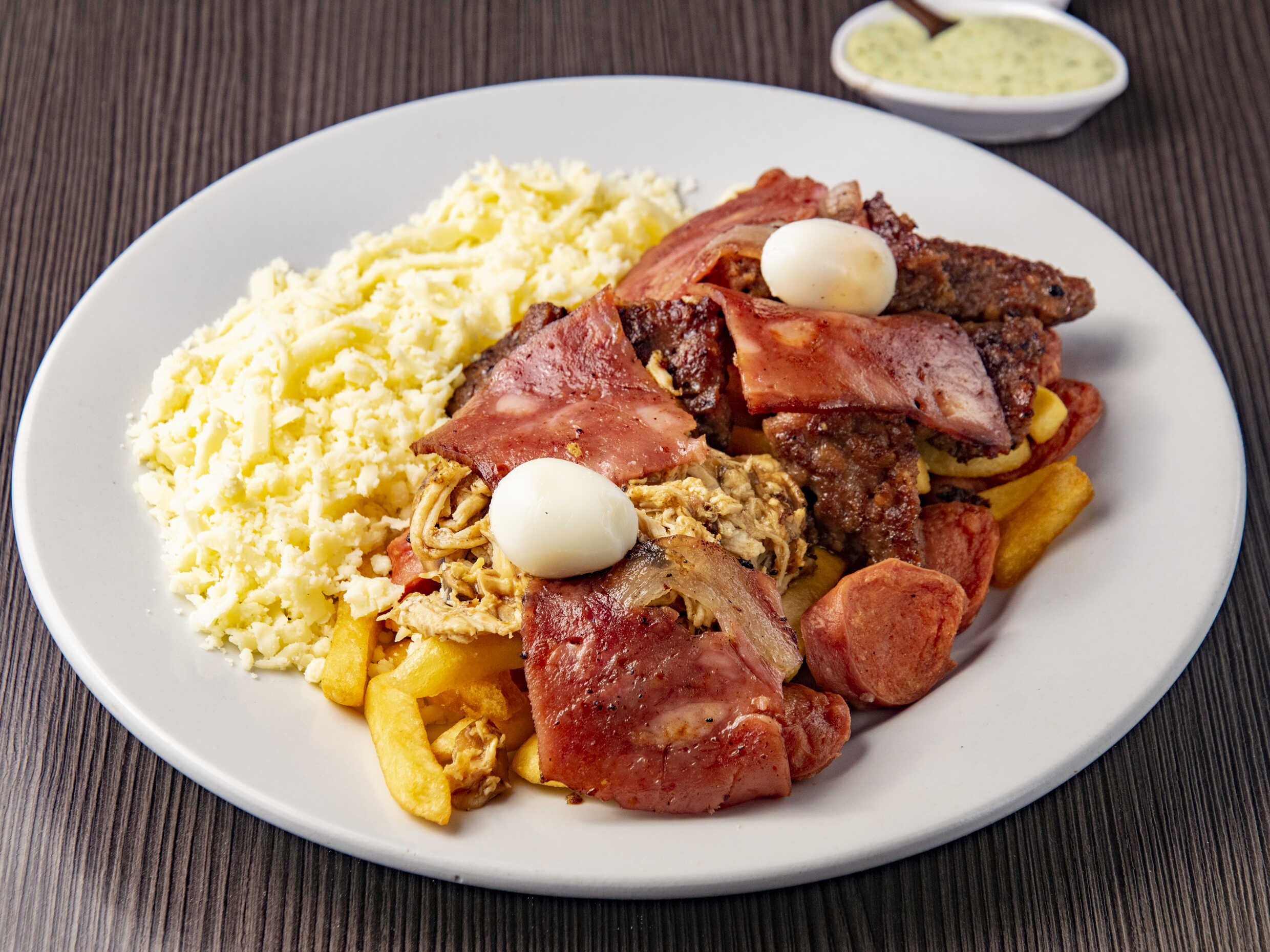 Salchicha america, papa a la francesa, huevo de codorniz, carne desmechada, guacamole y pico de gallo.