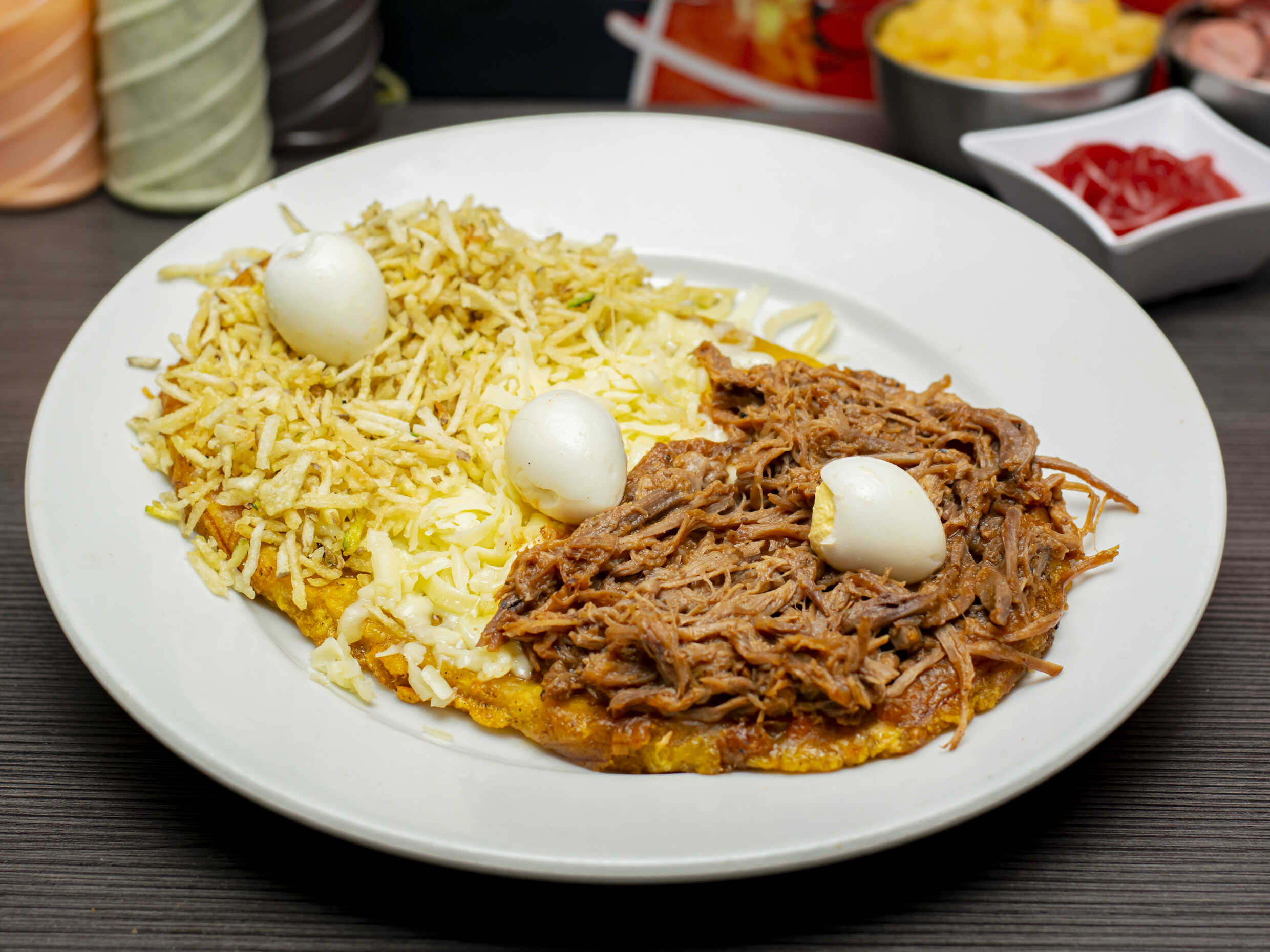 Arepa de maiz con carne desmechada, pollo, hogao, huevo de codorniz y queso.