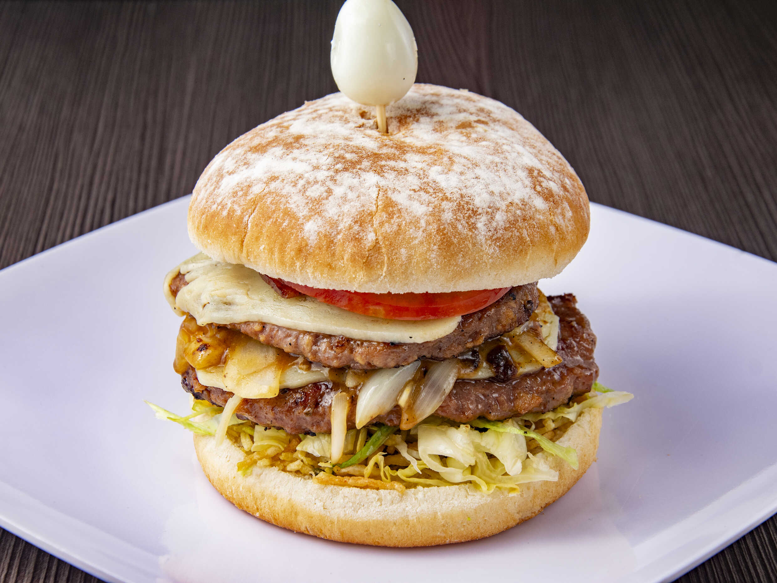 Con doble queso, tocineta, huevo de codorniz, tomate, lechuga, cebolla, papa chips.
