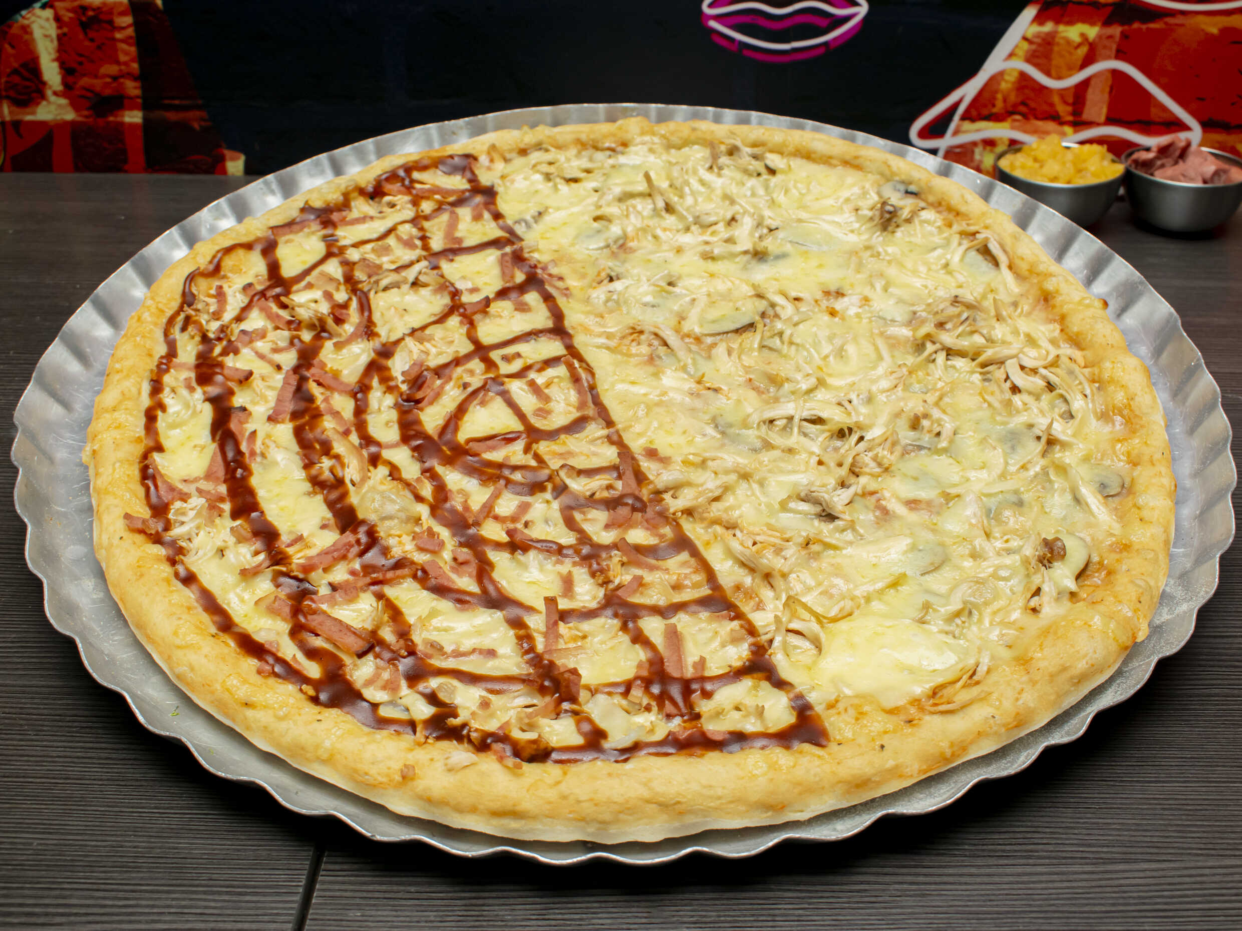 Pollo apanado, pollo desmechado, champiñon, tocineta, vegetales, salsas y queso.