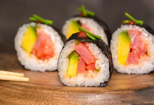 Sushi de 10 makis con atún, aguacate y palmitos en salsa dinamita