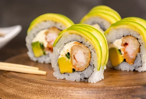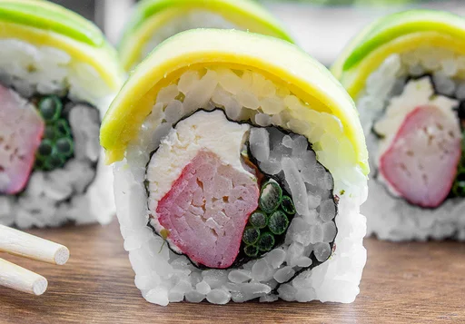Sushi de 10 makis con palmitos, queso crema y cebollín, cubierto con aguacate..