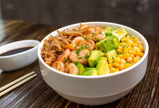 Poke con camarones, cebolla crispy, maíz dulce, aguacate, cilantro, salsa citrus
