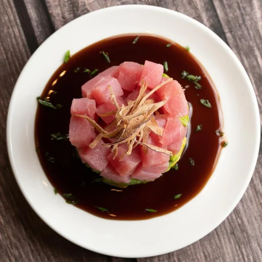 Atún macerado en salsa de soya dulce, sobre cama de aguacate y cebolla tempurizada.