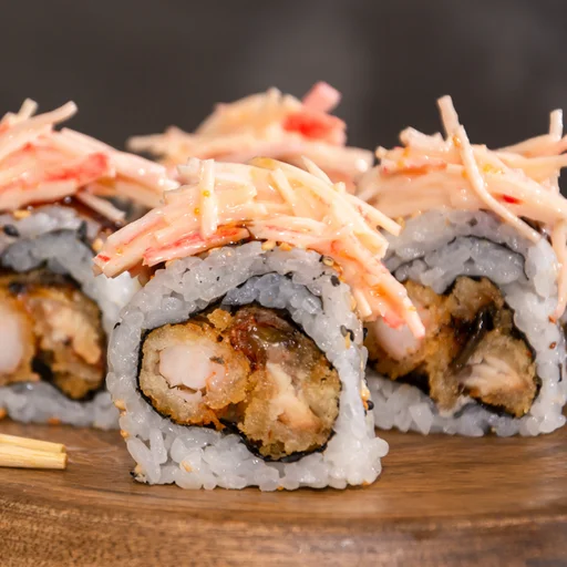 Sushi de 10 makis con kanikama osaki crispy y langostino crispy, cobertura de kanikama en salsa dinamita.