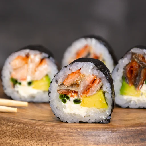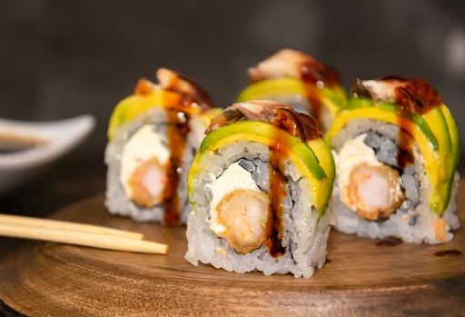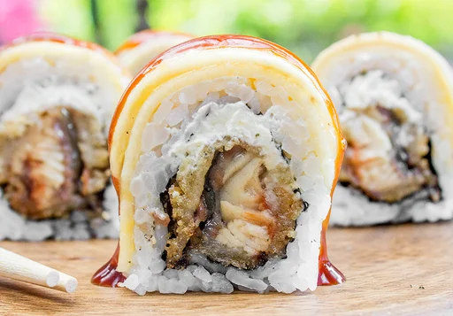 Sushi de 10 makis con anguila crispy, salmón tempura, queso crema, aguacate, masago, salsa unagi.