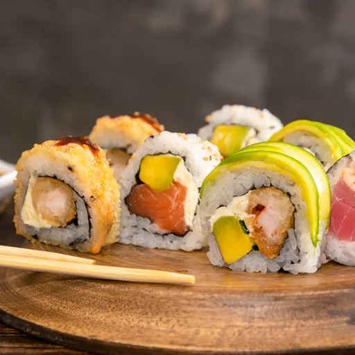 Sushi de 10 makis con langostino tempura, queso crema, salsa dinamita, aguacate, carpaccio de anguila.