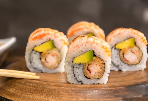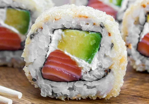 Sushi tempurizado de 10 bocados, con salmón, queso crema, aguacate y sésamo.