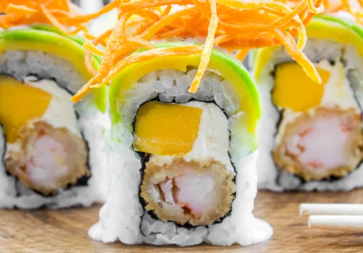 Sushi de 10 makis con langostino tempura, mango, queso crema, aguacate, salsa de palmito y zanahoria crispy.