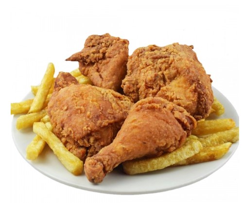 4 Piernas de pollo al broaster acompañadas de papa a la francesa y salsas.
