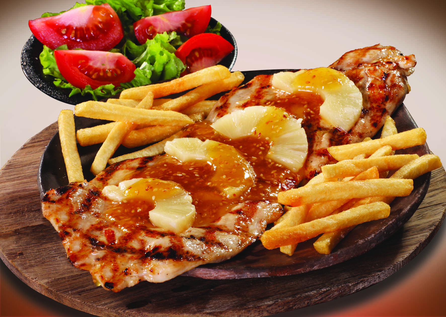 Pechuga a la plancha con piña en cuadritos acompañada de arroz, papa a la francesa, patacón y ensalada.
