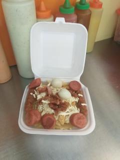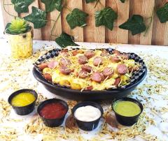 Papas a la francesa, chorizo, queso, huevo de codorniz y salsas (tomate, mayonesa, mostaza).
