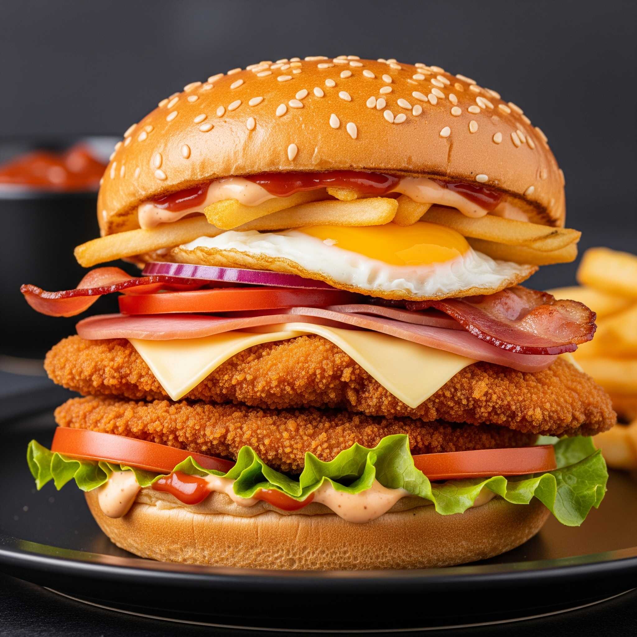 2 Medallones de pollo apanado, jamón, queso, lechuga, tomate, papas chips, tocineta, huevo de codorniz y salsas (tomate, mayonesa, mostaza).
