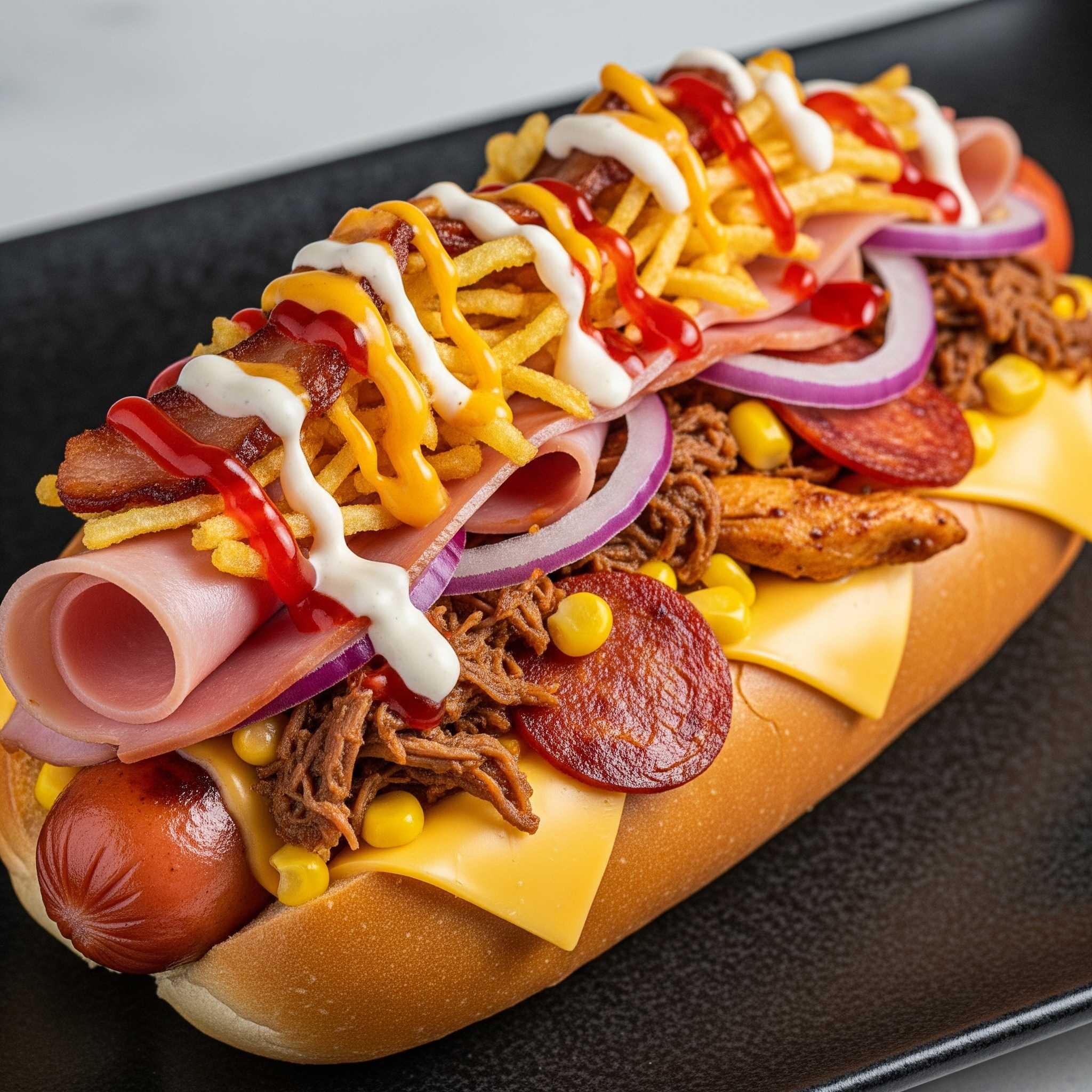 Salchicha long, jamón, queso, cebolla, tocineta, huevo de codorniz, papas chips y salsas (tomate, mayonesa, mostaza).
