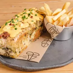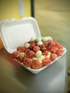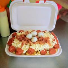 Papas a la francesa, chorizo, salchicha long y americana, tocineta, maíz, queso, papa chips, vegetales, huevo de codorniz, queso mozzarella y salsas (tomate, mayonesa, mostaza).