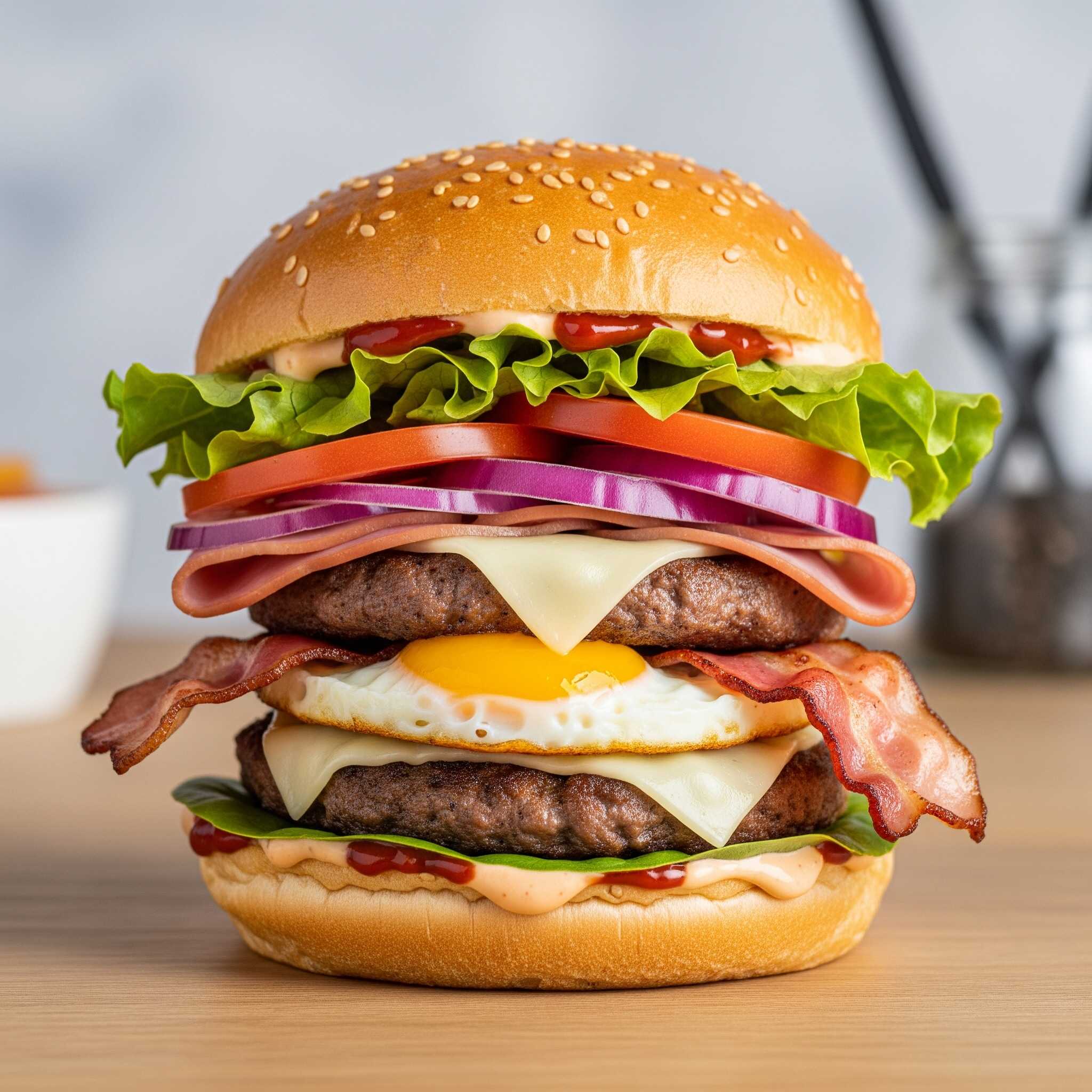 3 Carnes de res, jamón, queso, lechuga, tomate, cebolla, papas chips, tocineta, huevo de codorniz y salsas (tomate, mayonesa, mostaza).