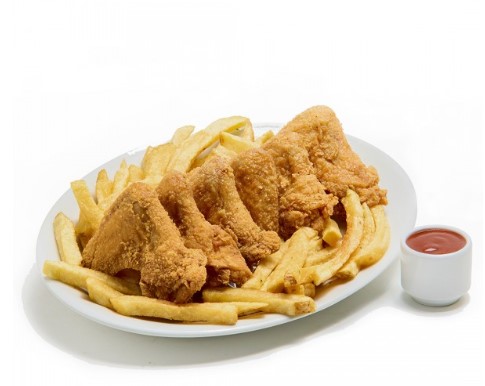8 Muslitos de pollo al broaster acompañadas de papa a la francesa y salsas.
